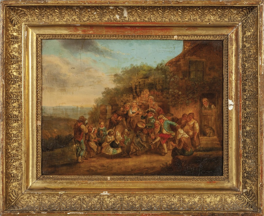 Il dileggio della nobiltà, olio su tavola, scuola fiamminga fine secolo XVIII inizi secolo XIX