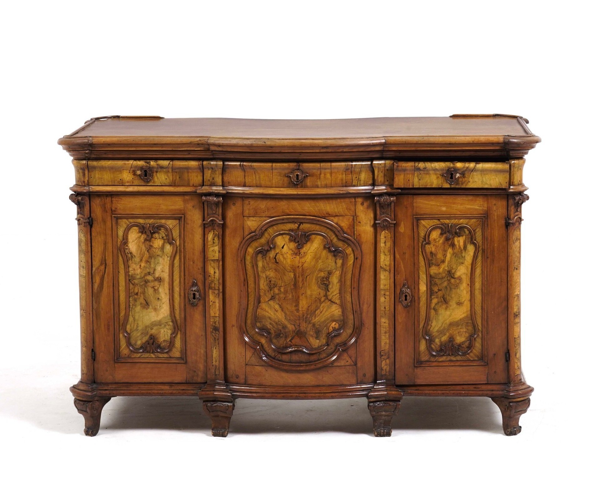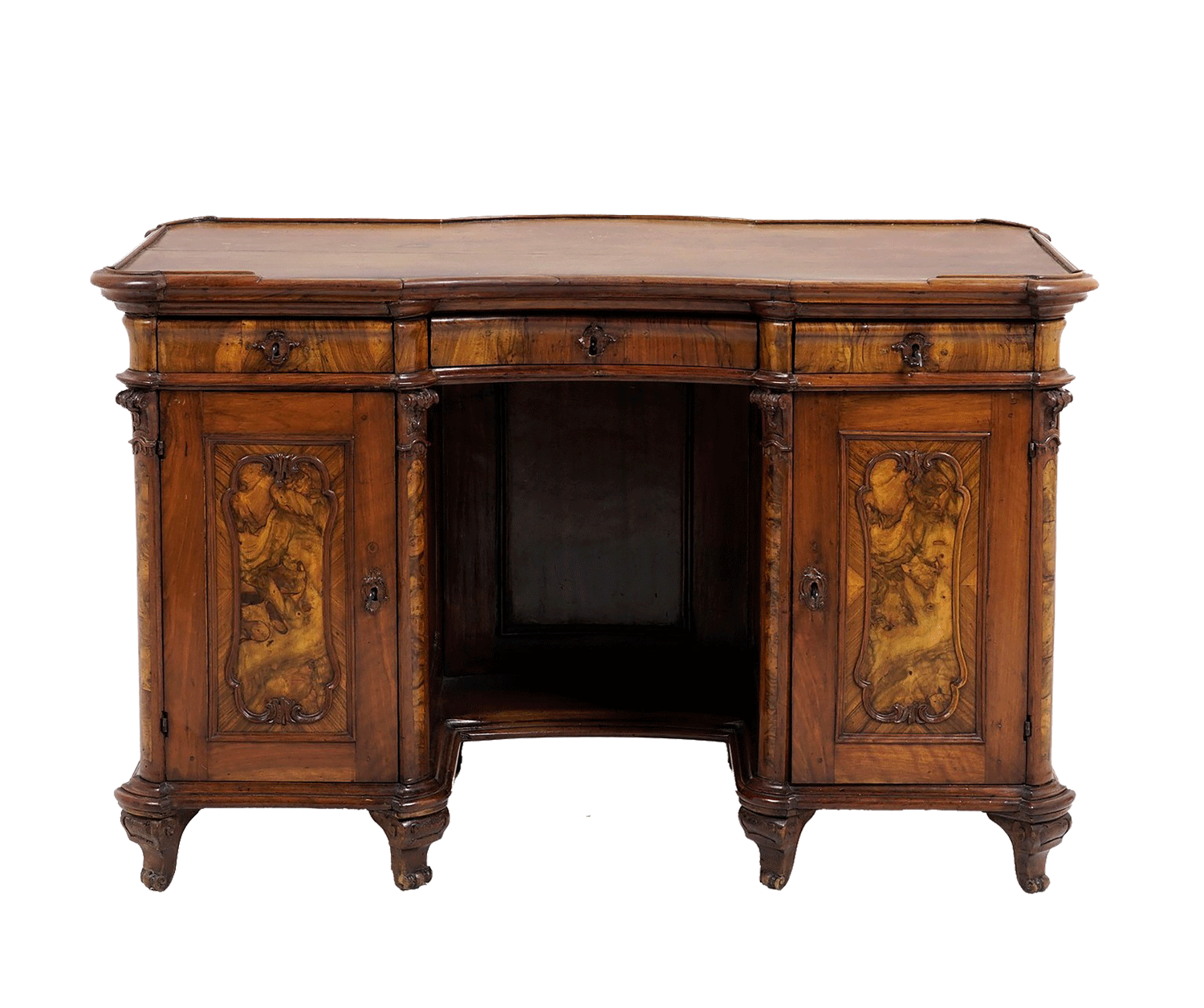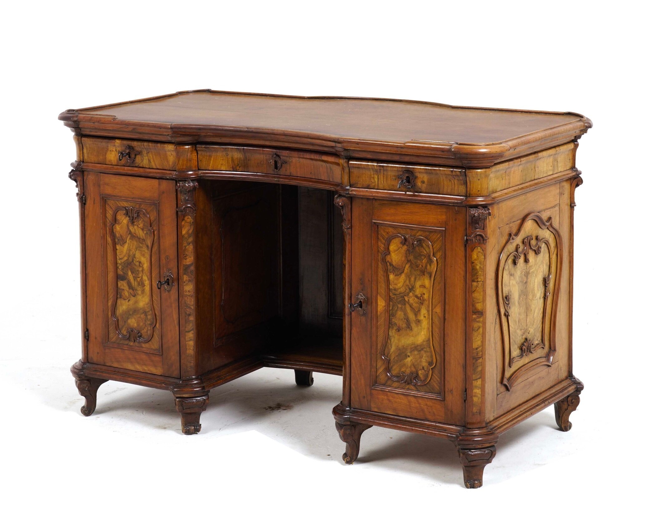 Realizzata in noce e radica di noce con elementi intagliati e due ante laterali e tre cassettini disposti sotto il piano di scrittura; le ante laterali e i cassetti centrali sono impreziositi da modanature e serrature in legno sagomato. Il piano superiore, leggermente sagomato, poggia su struttura mossa e articolata.