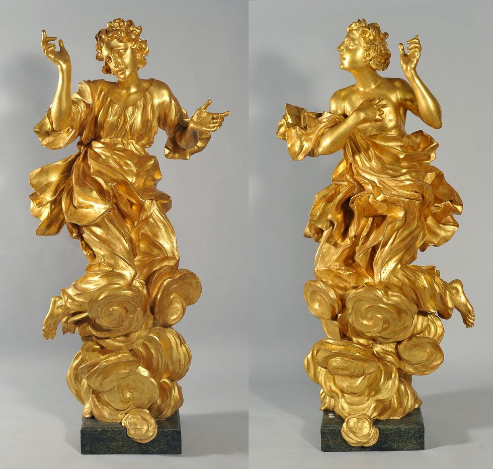 Angeli sorretti da basi a forma di nuvole, coppia di sculture barocche in legno intagliato e dorato, Roma XVI-XVII secolo