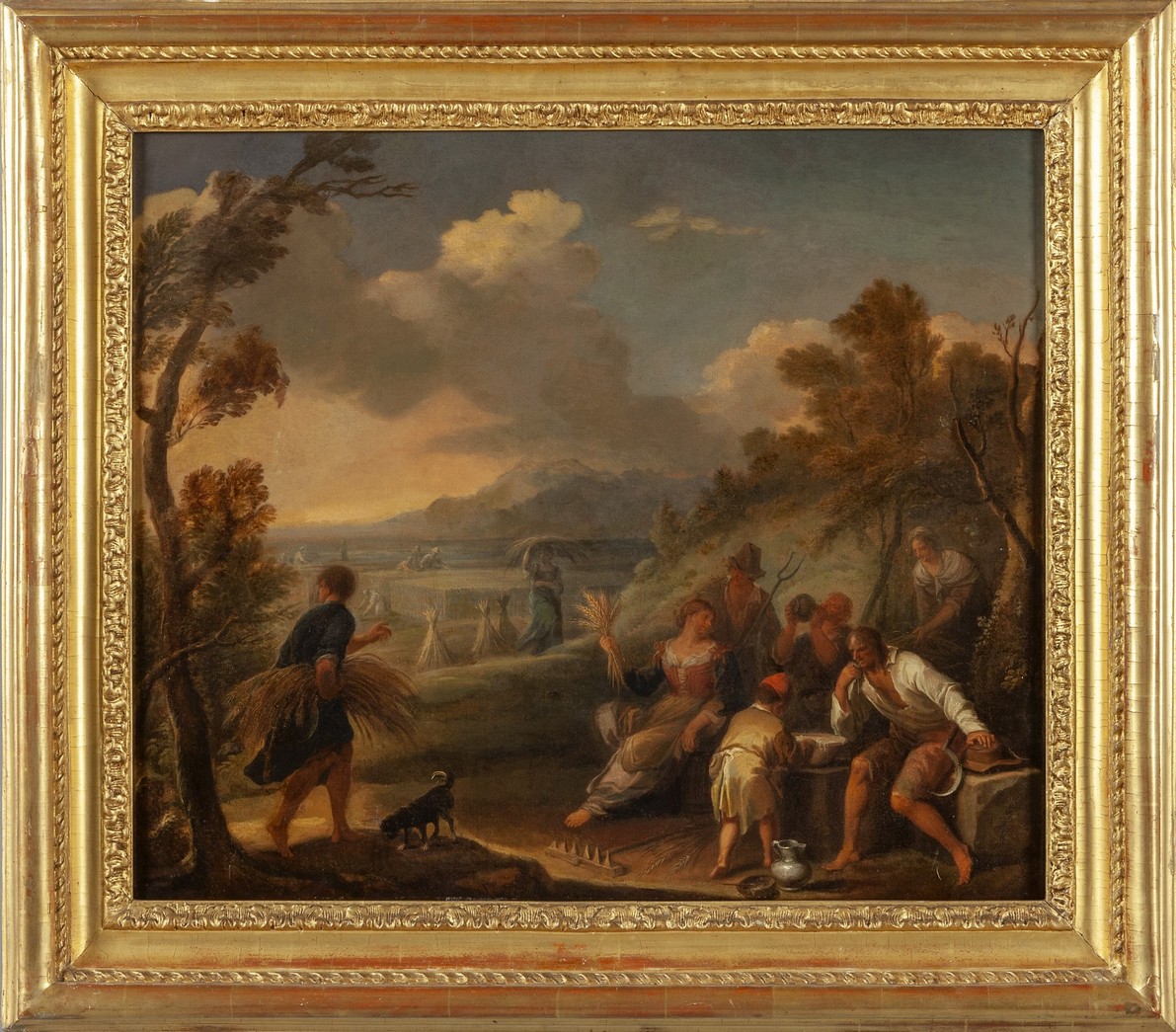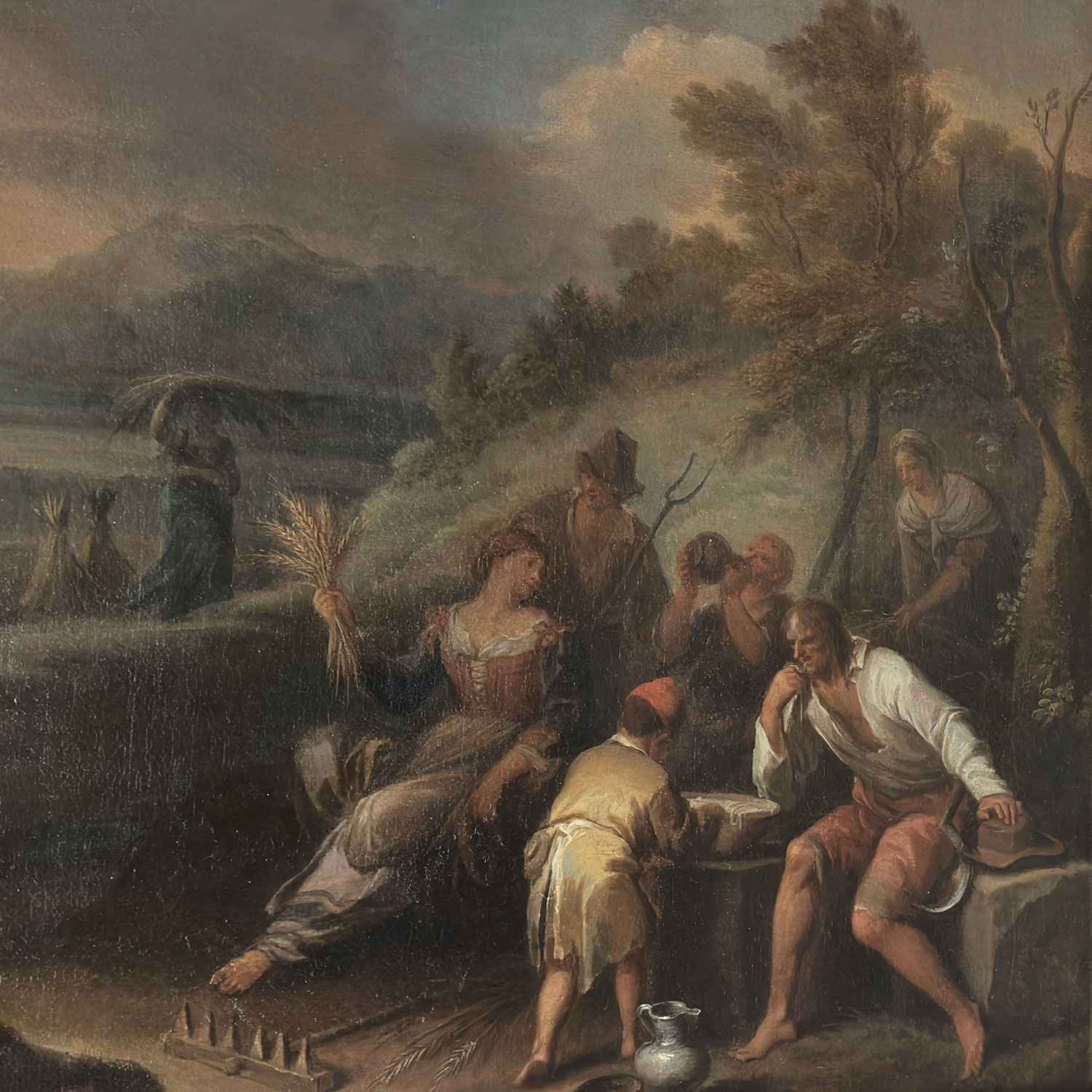 Il tema della raccolta del grano, caro alla pittura di genere del XVIII secolo, celebra il mondo contadino come modello di semplicità e naturalezza. L’opera rievoca l’atmosfera idilliaca del lavoro nei campi, rendendolo soggetto degno di ammirazione estetica e morale.