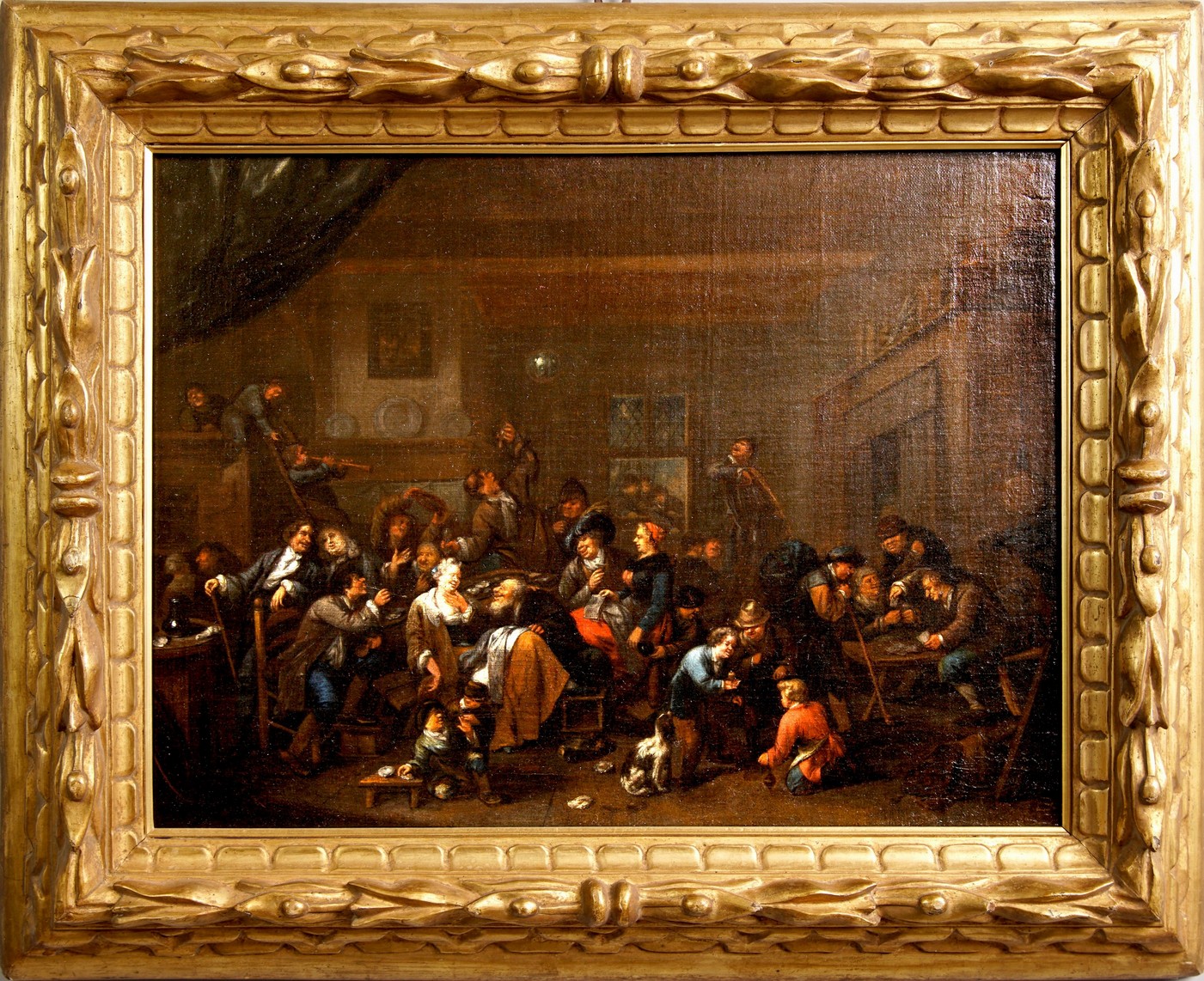 Interno di osteria animata da molte figure, olio su tela scuola francese fine secolo XVII inizi secolo XVIII