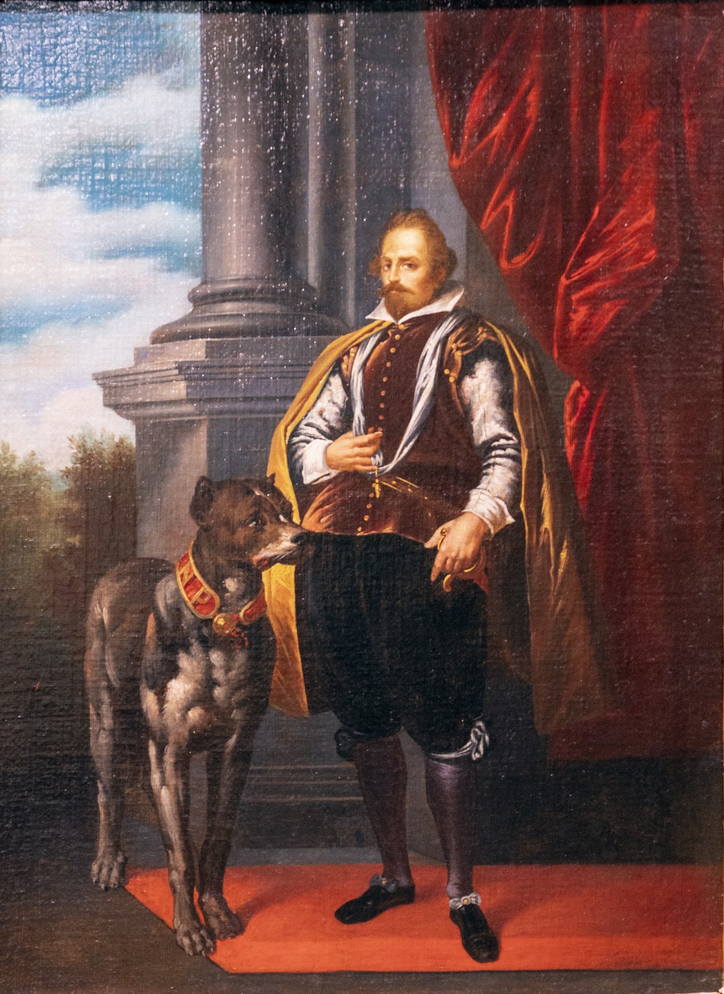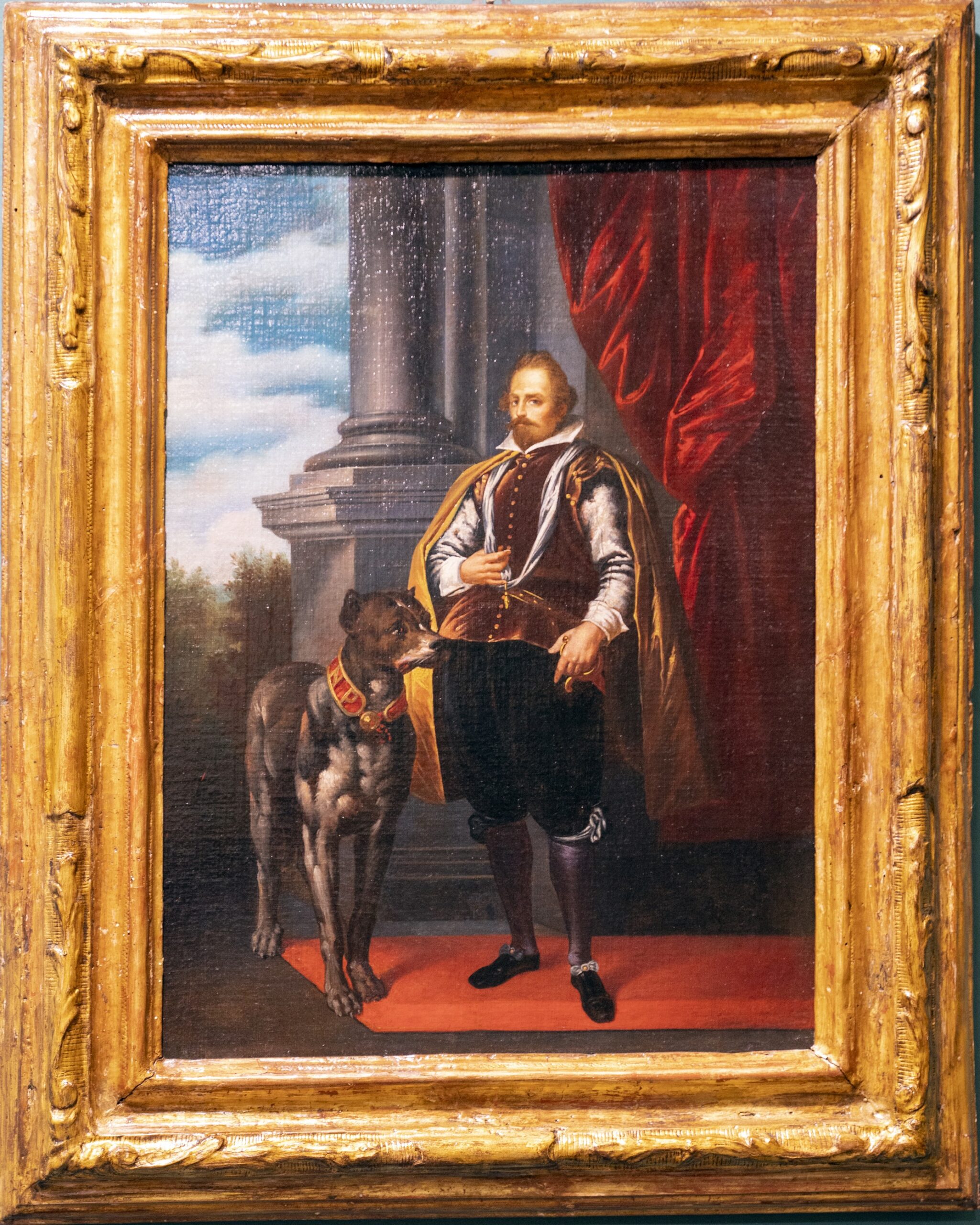 Il personaggio, vestito con abiti ricercati e dallo sguardo fiero, è reso con attenzione psicologica e gusto ritrattistico tipico della pittura genovese barocca, che coniuga influssi caravaggeschi e modelli fiamminghi. Accanto a lui, il cane, simbolo di fedeltà e potere, è ritratto con naturalismo e maestria tecnica, sottolineando il legame affettivo e sociale tra uomo e animale.
