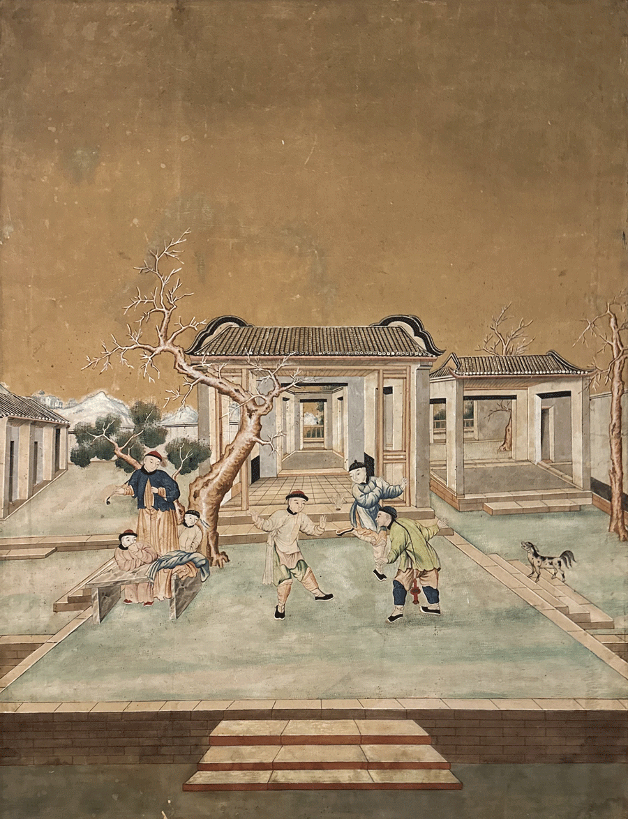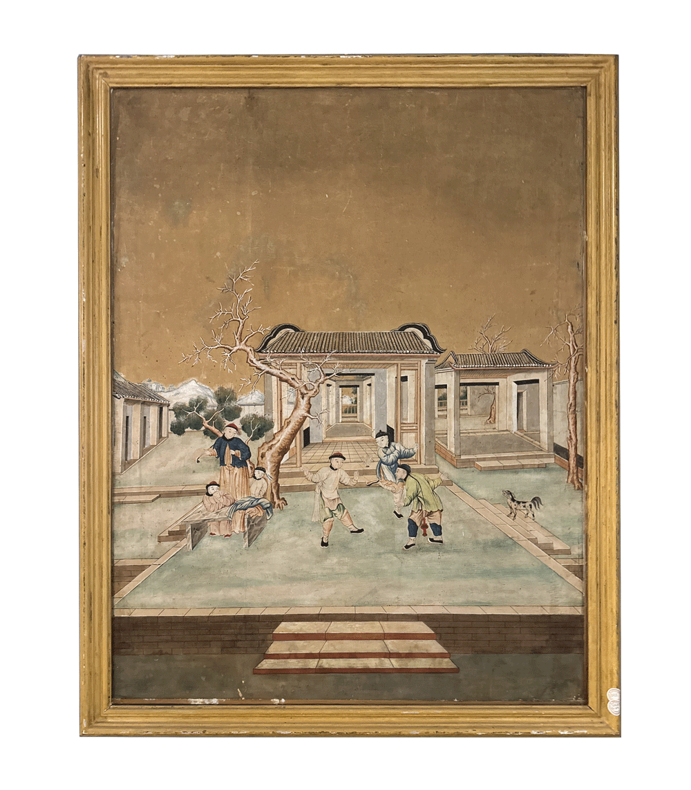 E’ qui raffigurata una scena animata con personaggi cinesi e animali, tipica dell’arte orientale che ha influenzato l’Occidente nel XVIII secolo. I personaggi, ritratti in un ambiente domestico, sono circondati da un paesaggio stilizzato con elementi naturali e architettonici che evocano il fascino della cultura cinese.