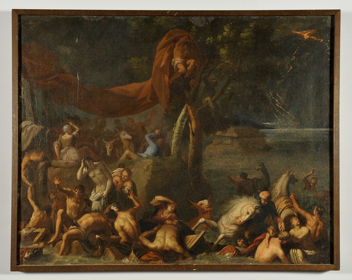 Il dipinto raffigura il celebre episodio biblico del Diluvio Universale, un tema che trova una vasta tradizione nell’arte occidentale. Il soggetto è tratto dal racconto della Genesi, con Noè e la sua famiglia testimoni di una catastrofe che coinvolge la distruzione di tutta l’umanità, mentre solo i giusti sopravvivono. In questa versione, l’artista mostra una scena drammatica in cui le acque stanno sommersi gli esseri umani e gli animali, mentre alcuni cercano disperatamente di salvarsi. Il colore intenso e il movimento delle figure, spesso esasperato per dare un senso di caos e terrore, sono tratti distintivi dello stile di quest’opera.