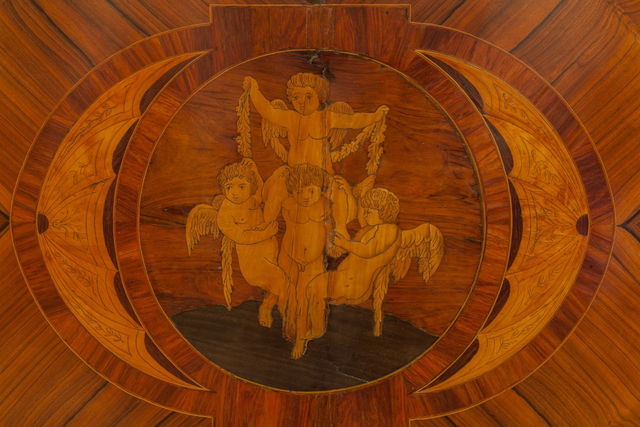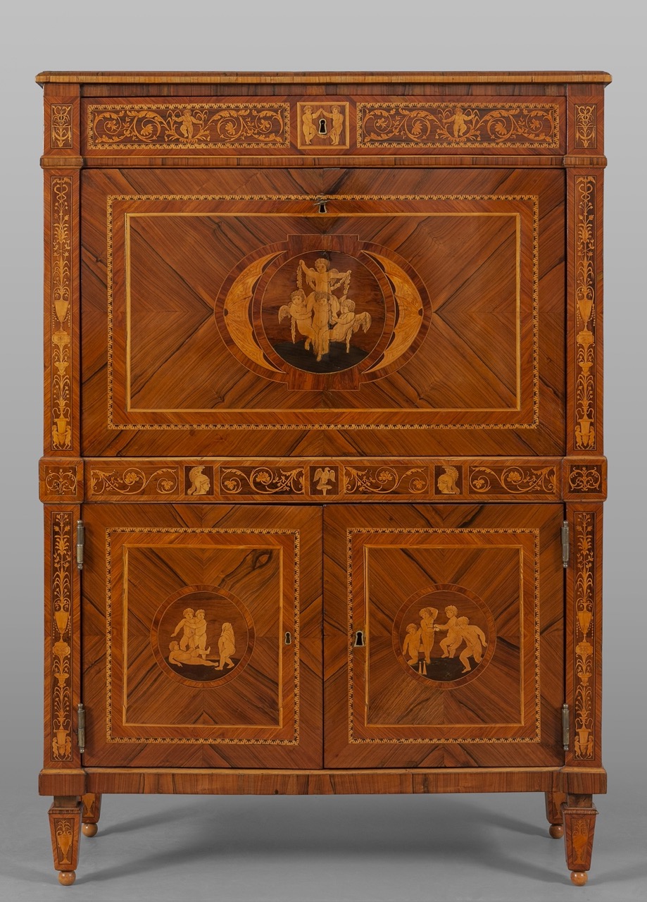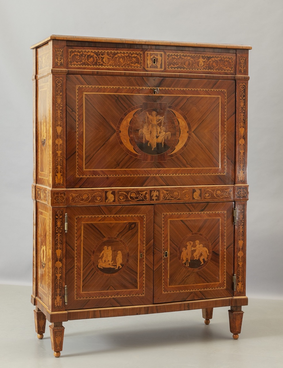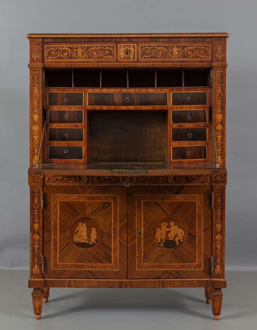 A due sportelli e calatoia, lastronato e intarsiato in legni esotici e di frutto. Il mobile è composto da un cassetto sottopiano , un anta a ribalta e due ante nella base. L’intera superficie è lastronata in legno di viola suddivisa da filettature in bosso e legno di rosa. Nella fascia sottopiano il decoro intarsiato è a motivo di girali vegetali. Nelle riserve della calatoia e degli sportelli intarsi a motivo di puttini. I montanti,sui fianchi e sul fronte,come sui piedi sono intarsiati con motivi di candelabra con fiori e putti. Mobile di altissima qualità costruttiva.