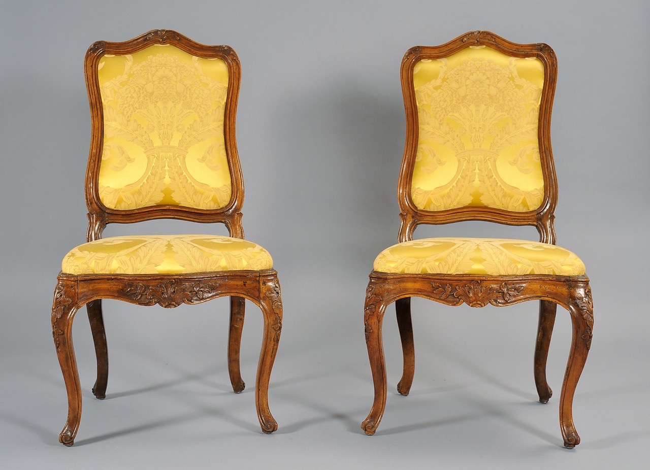 Sei sedie Luigi XV in noce intagliato a motivo di pellacce, Genova metà secolo XVIII