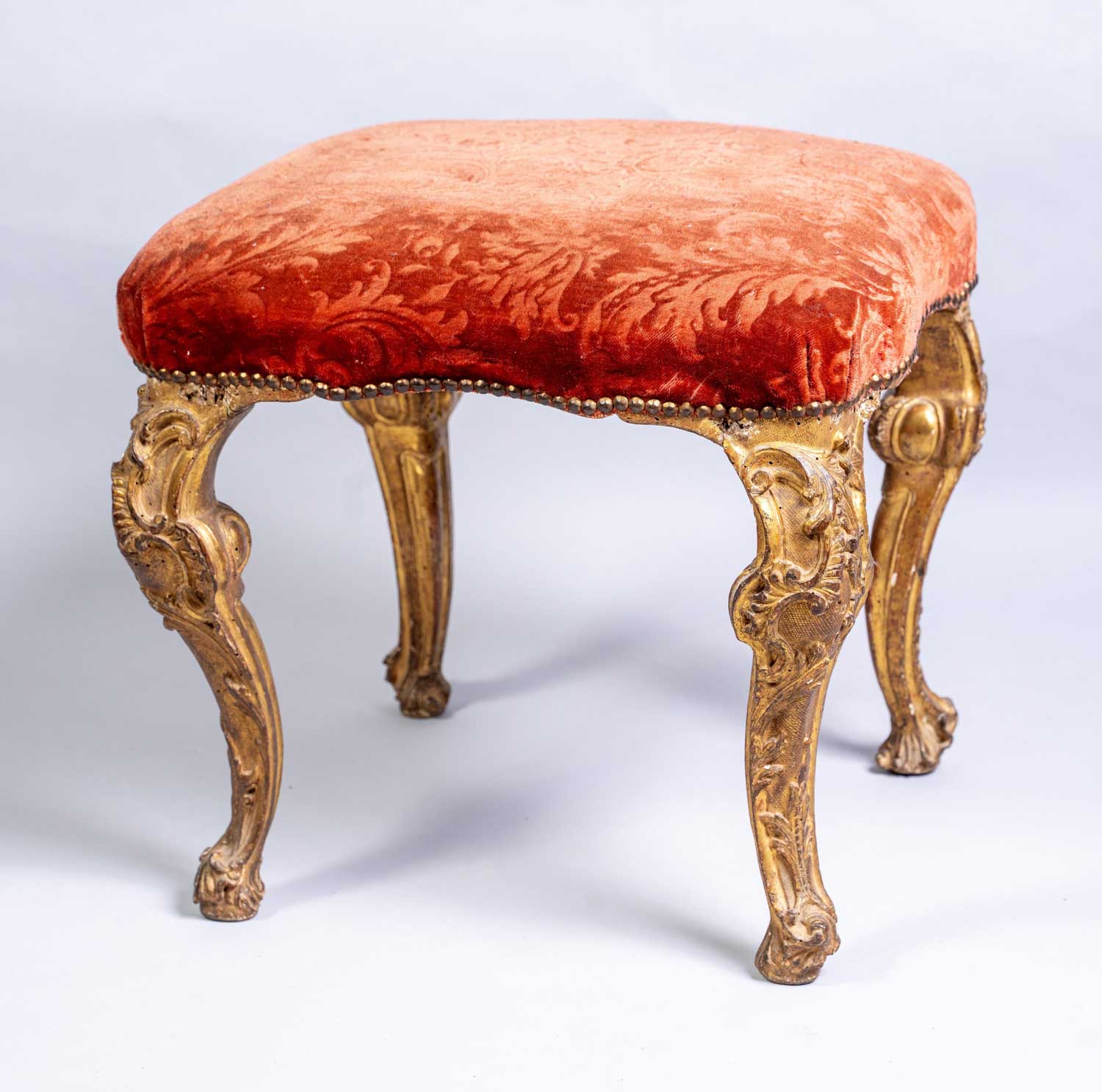 Seduta quadrata sagomata rivestita in velluto rosso goffrato su gambe foliate e intagliate a rocaille