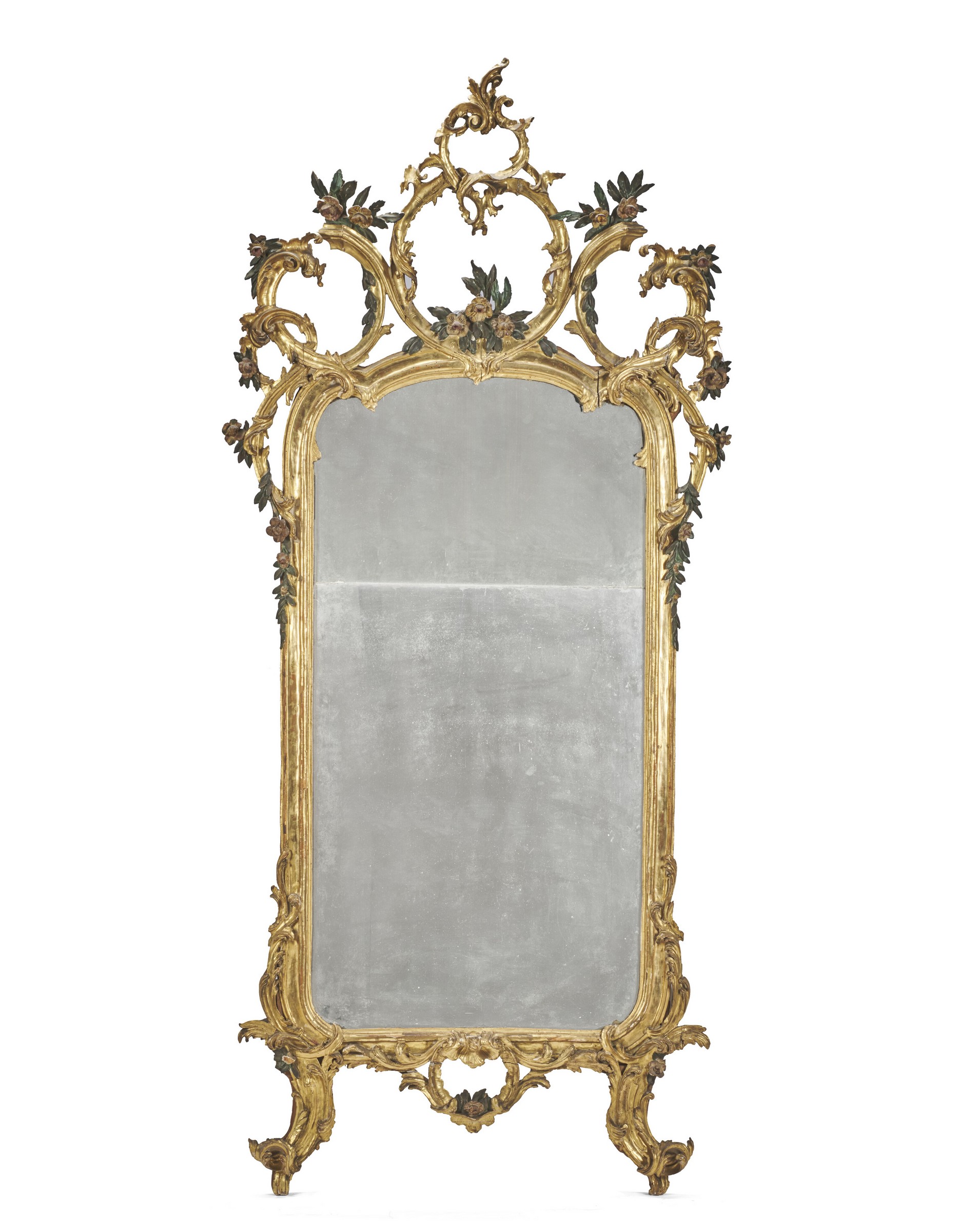 Specchiera con cornice in legno finemente intagliato, dorato e policromato, Lombardia secolo XVIII