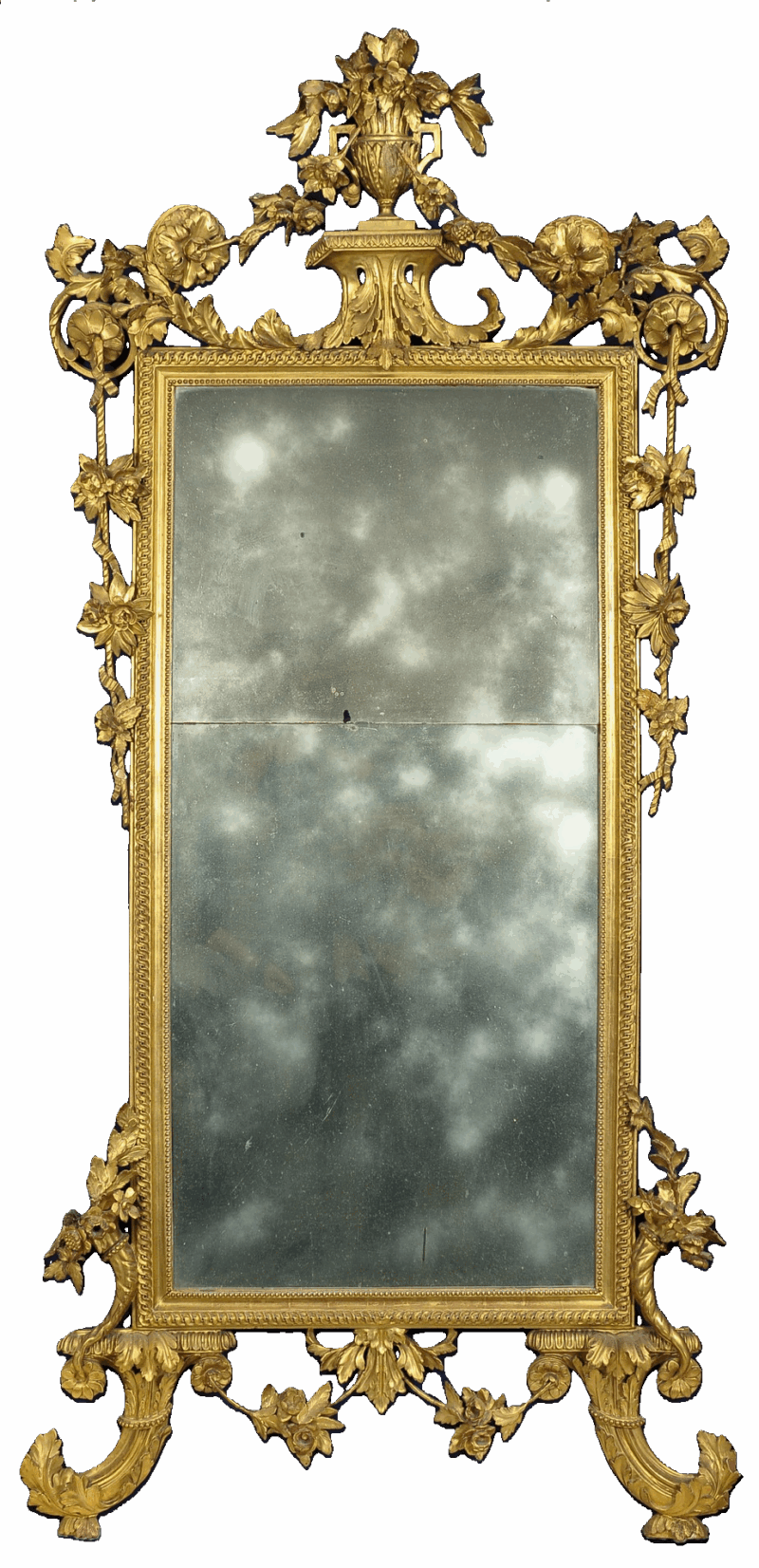 Cimasa riccamente intagliata a forma di vaso fiorito da cui si dipartono cordonature floreali.