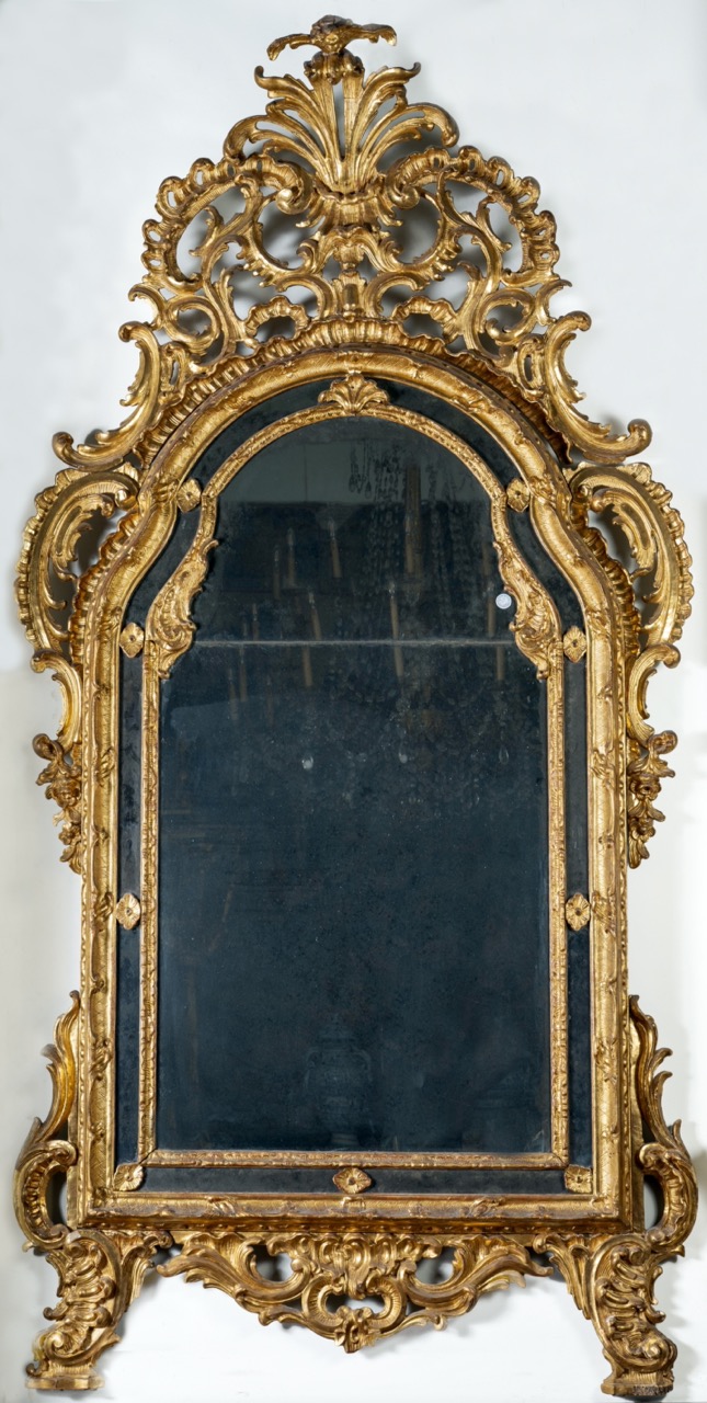 Grande specchiera Luigi XV in legno finemente intagliato e dorato con controspecchi, Piemonte prima metà secolo XVIII