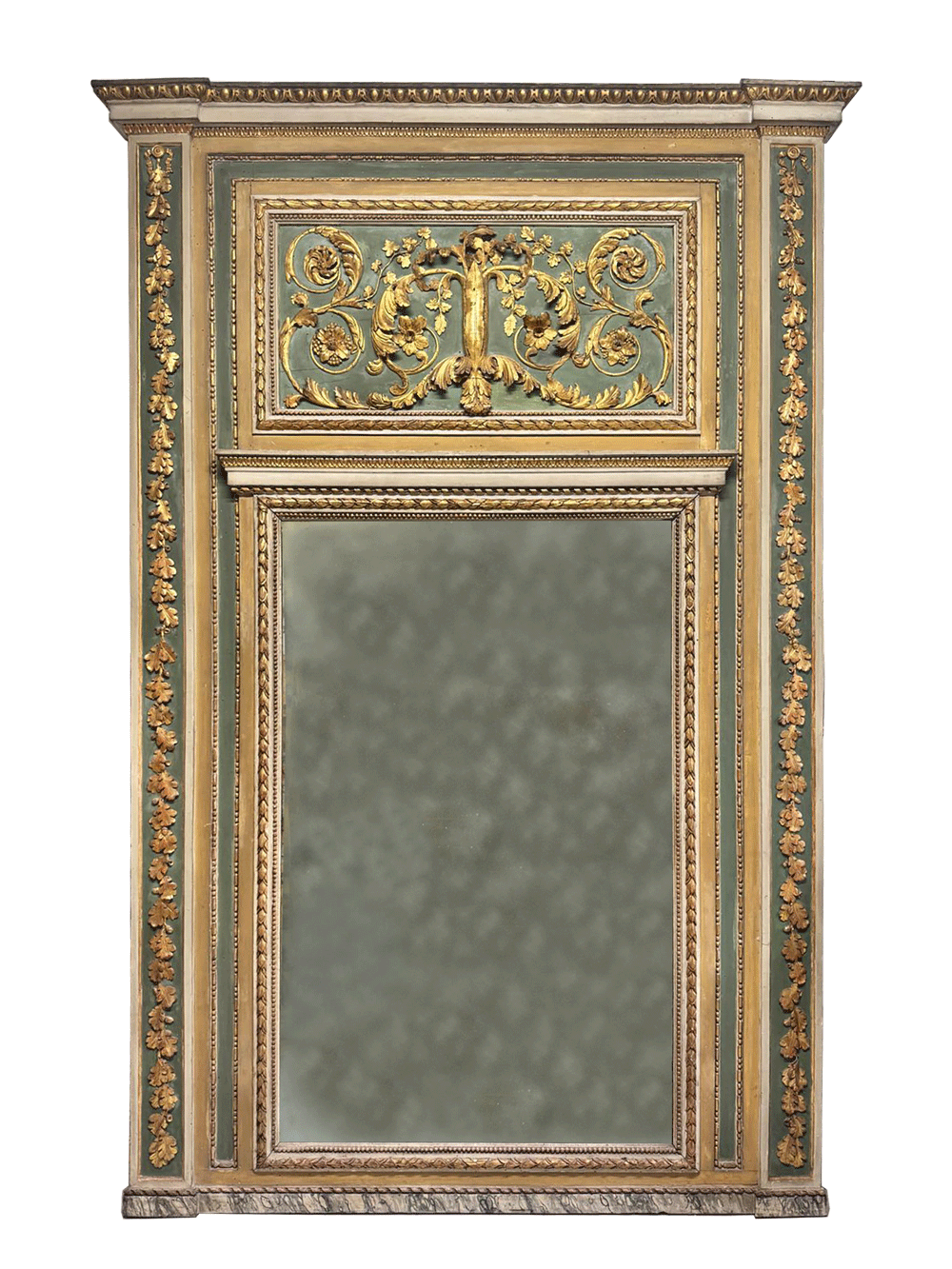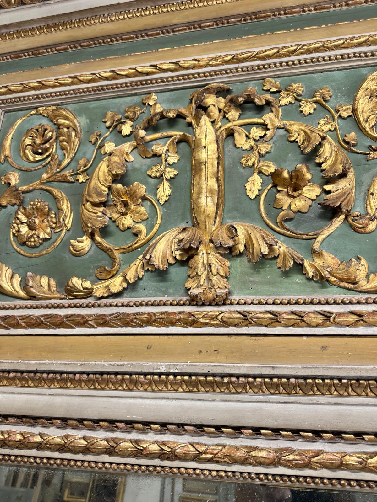 Imponente specchiera in legno finemente intagliato e dorato, con fregi a motivi vegetali su fondo verde. L’importante cornice architettonica racchiude la specchiera originale al mercurio, con patina coeva e un piccolo difetto.