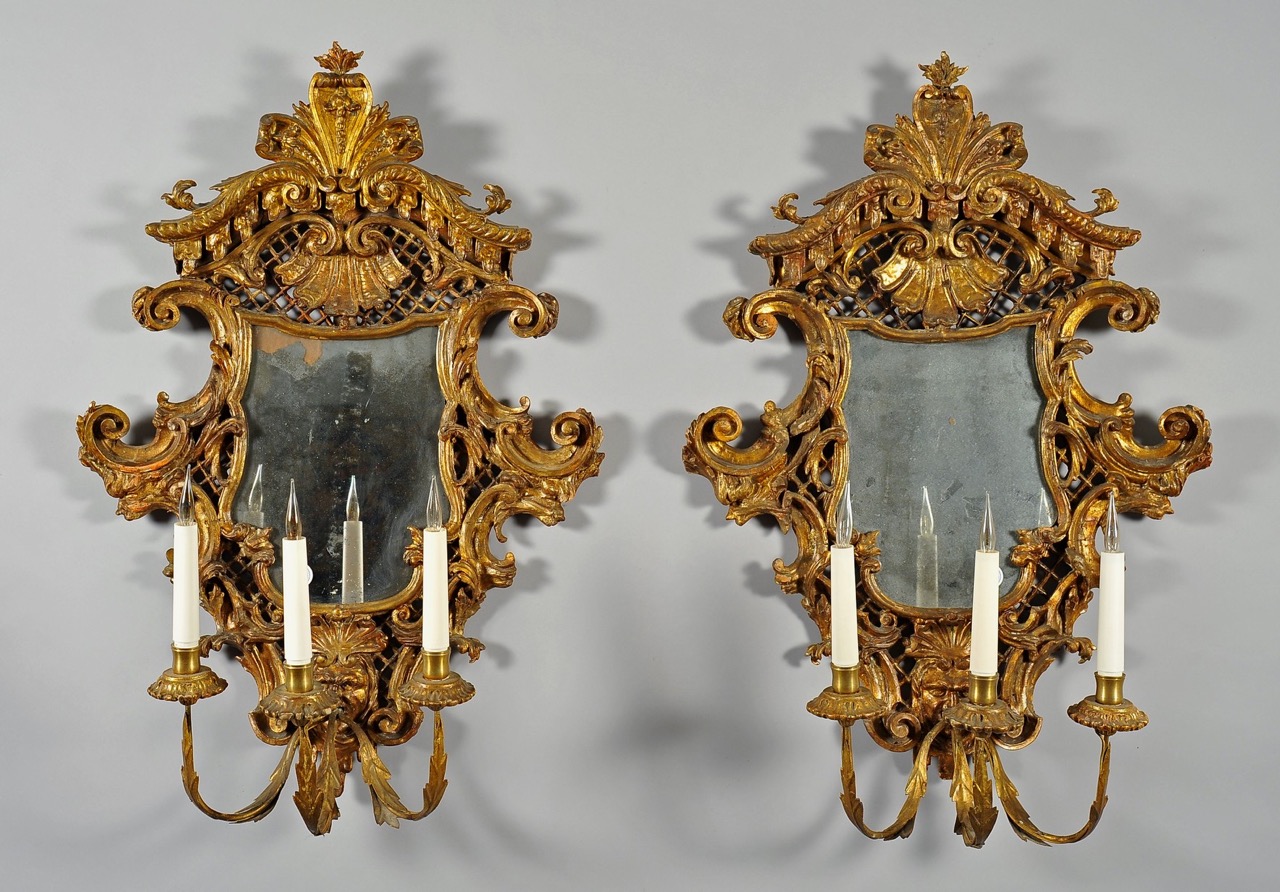 Coppia di appliques Luigi XV in legno finemente intagliato e dorato a mecca, Piemonte metà secolo XVIII