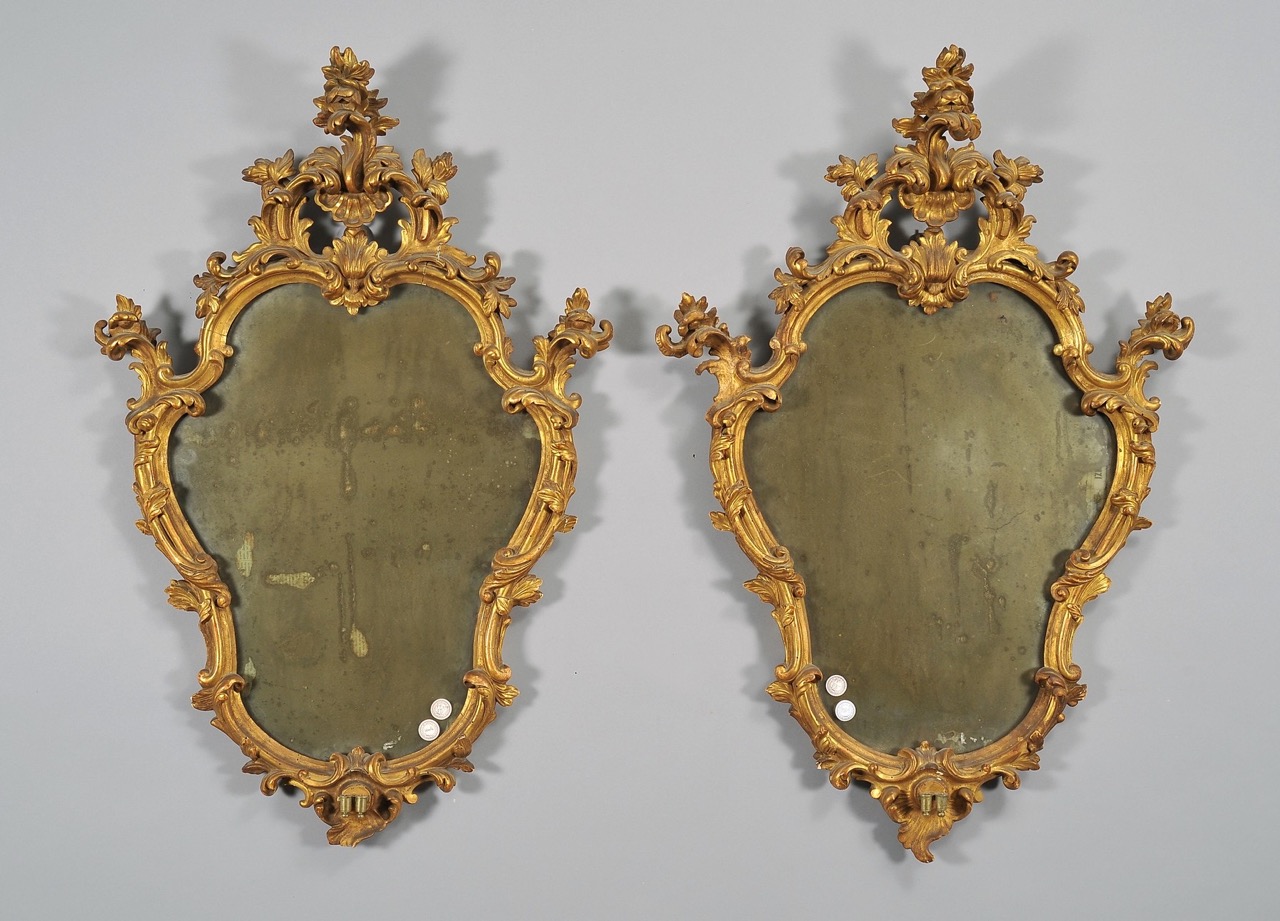 Coppia di specchiere Luigi XV in legno riccamente intagliato e dorato, Italia meridionale prima metà secolo XVIII