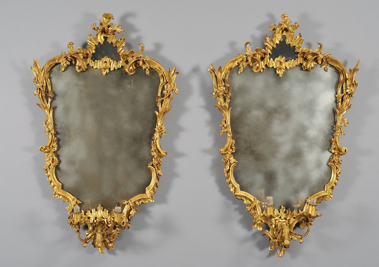 Coppia di specchiere Luigi XV in legno finemente intagliato e dorato con bracci portaluce e specchi antichi, Lombardia metà secolo XVIII