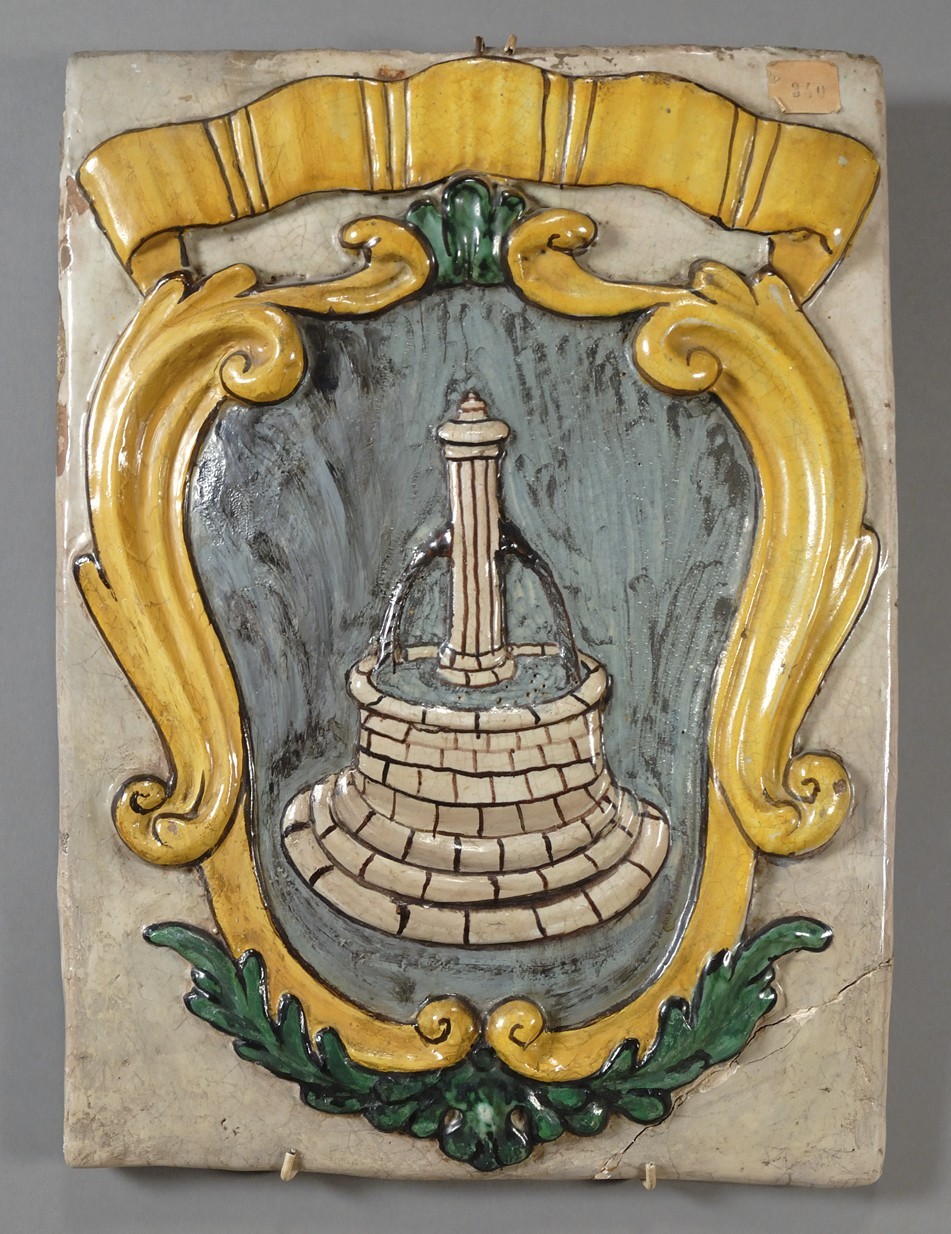 Antico stemma in terracotta policromo raffigurante Antica Fontana