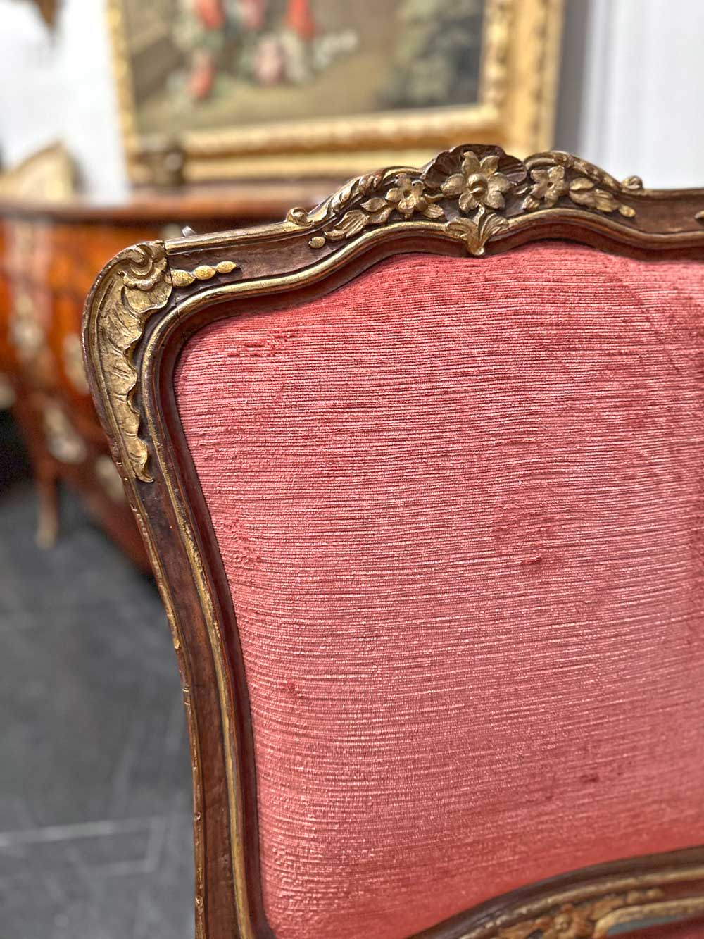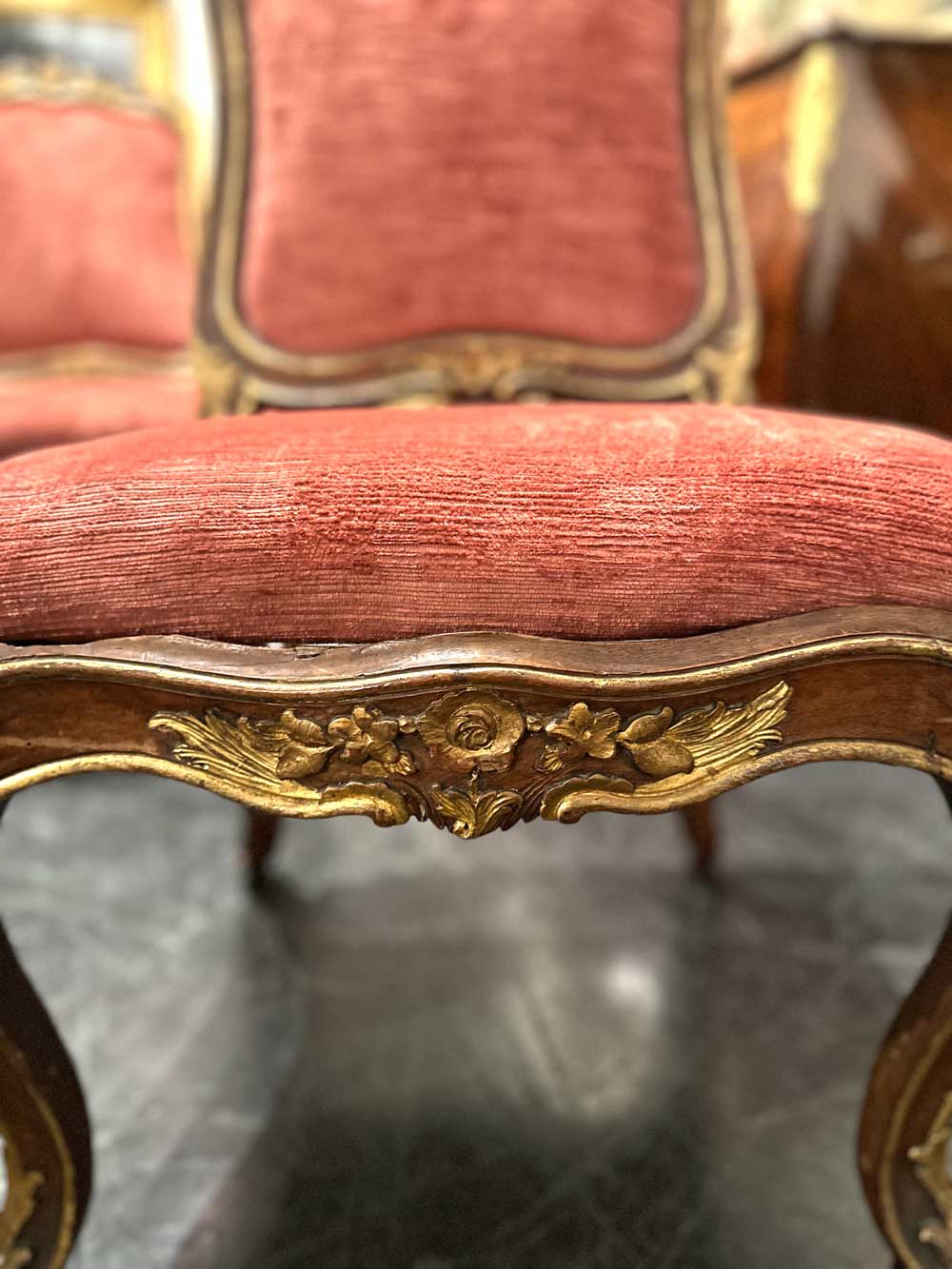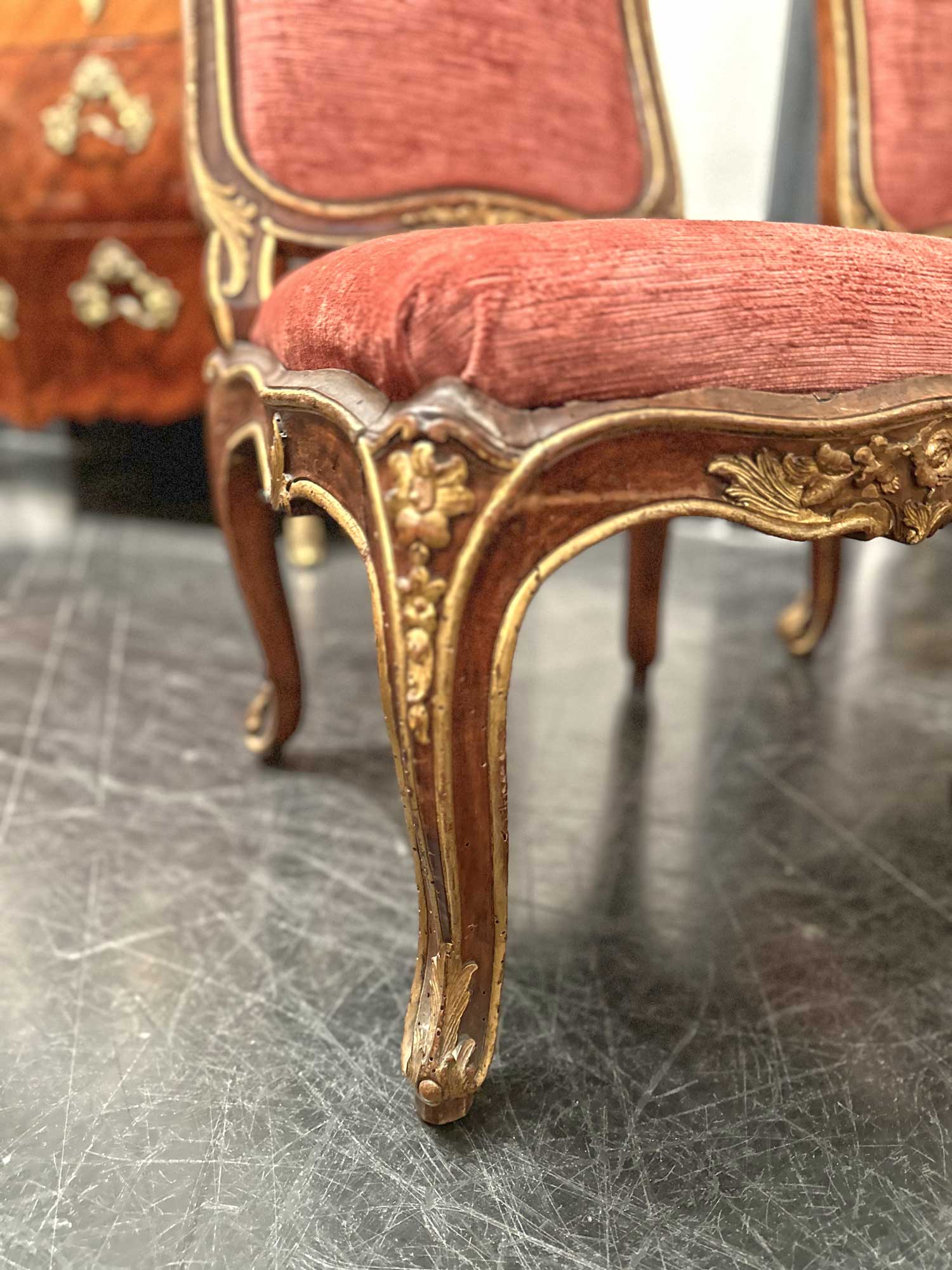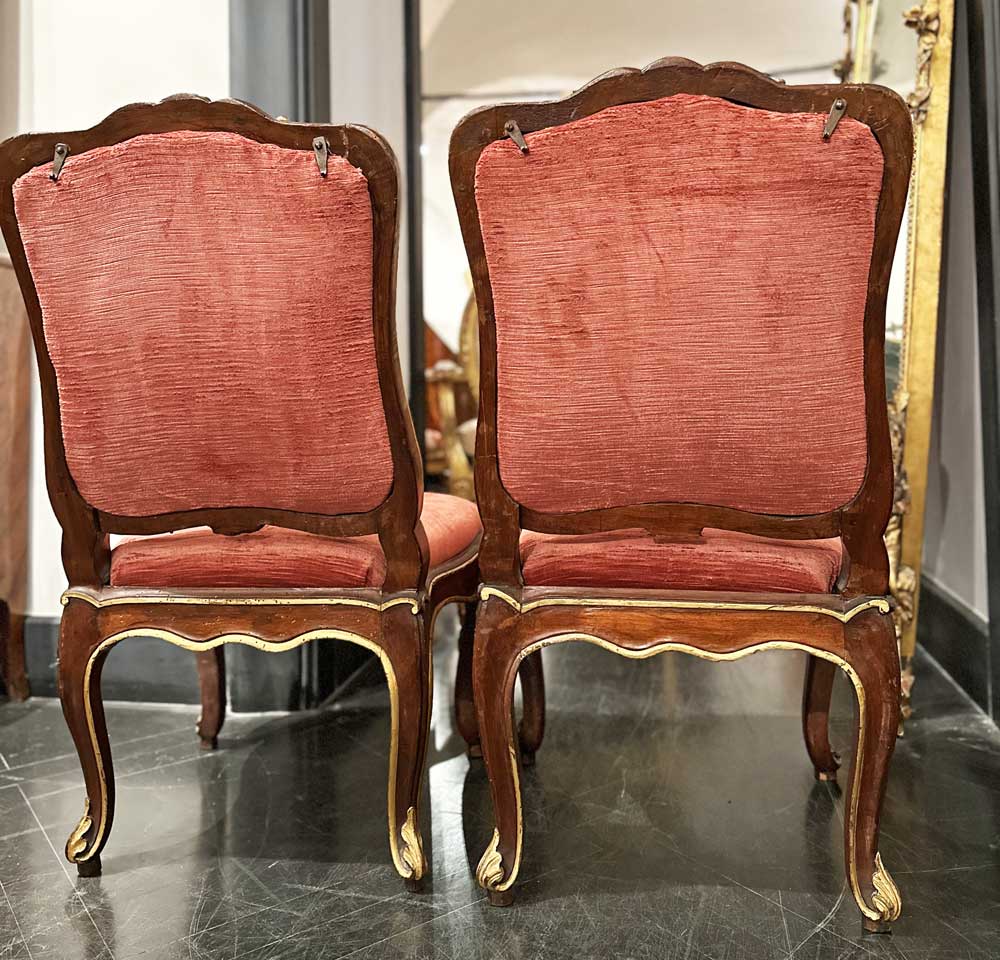 L’insieme risulta di gusto pienamente rococò, caratterizzato da un’elegante linea mossa e da una raffinata decorazione intagliata. La struttura in legno di noce è impreziosita da lumeggiature in oro che sottolineano profili, risalti e punti focali della scultura, valorizzando la qualità esecutiva e il ritmo sinuoso delle forme. Schienale e seduta presentano un andamento curvilineo e avvolgente, pensato per unire comodità e rappresentanza.