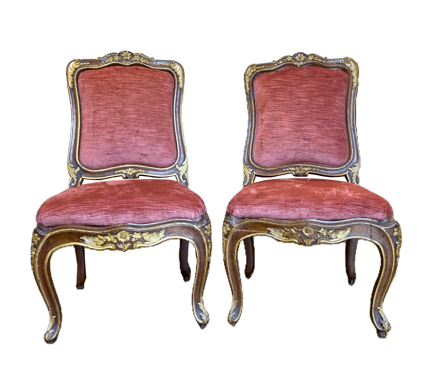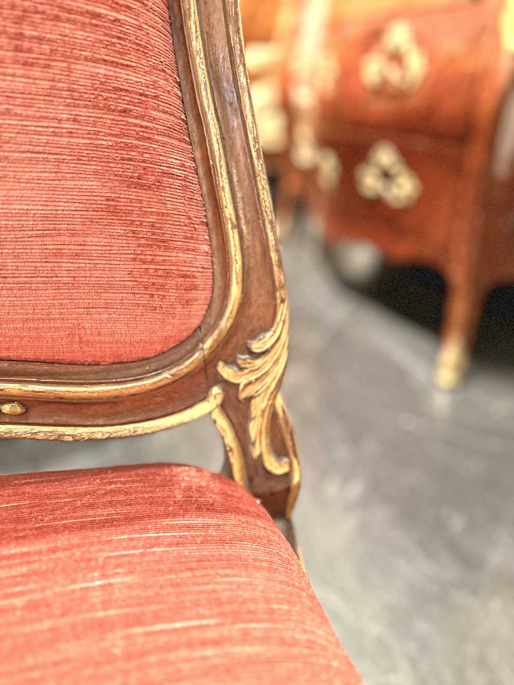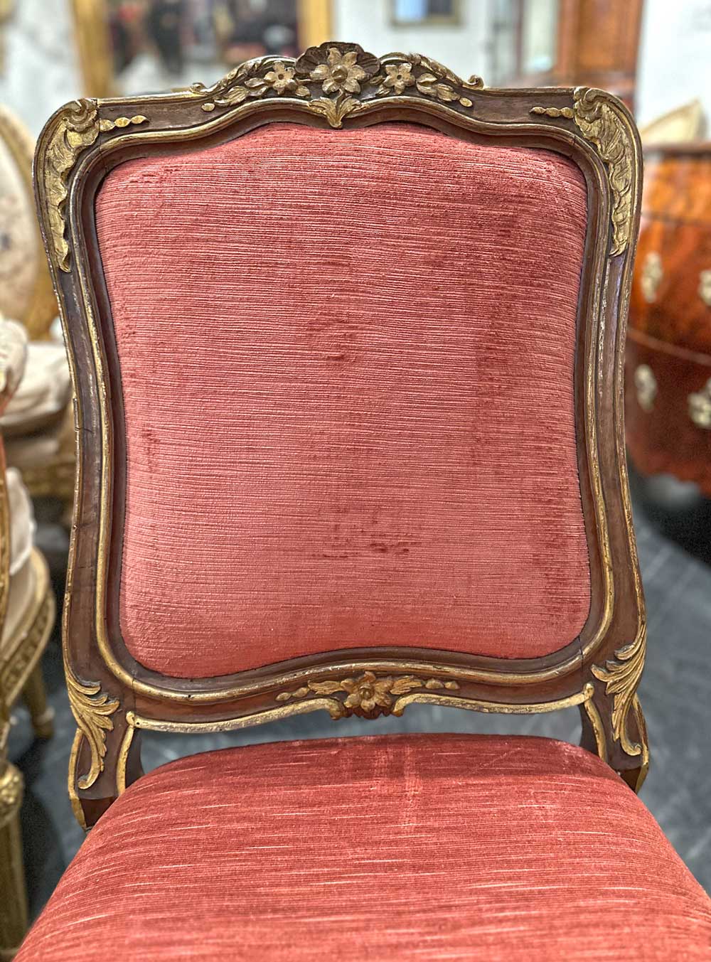 L’insieme risulta di gusto pienamente rococò, caratterizzato da un’elegante linea mossa e da una raffinata decorazione intagliata. La struttura in legno di noce è impreziosita da lumeggiature in oro che sottolineano profili, risalti e punti focali della scultura, valorizzando la qualità esecutiva e il ritmo sinuoso delle forme. Schienale e seduta presentano un andamento curvilineo e avvolgente, pensato per unire comodità e rappresentanza.