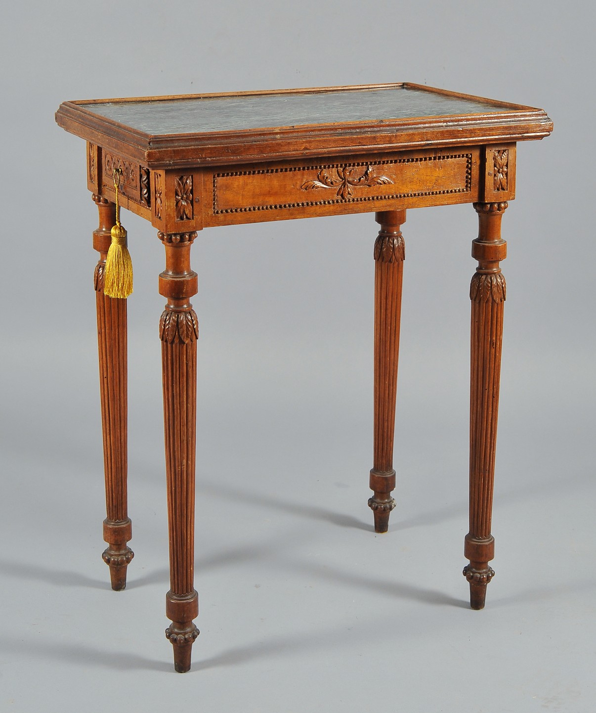 Il mobile, finemente intagliato in noce e impreziosito da un piano in marmo verde antico. dotato di un pratico cassetto a scomparsa, si distingue per la sobria raffinatezza delle decorazioni: motivi floreali, foglie d’acanto e gambe scanalate, ispirate all’ordine classico, testimoniano il gusto neoclassico dell’epoca.