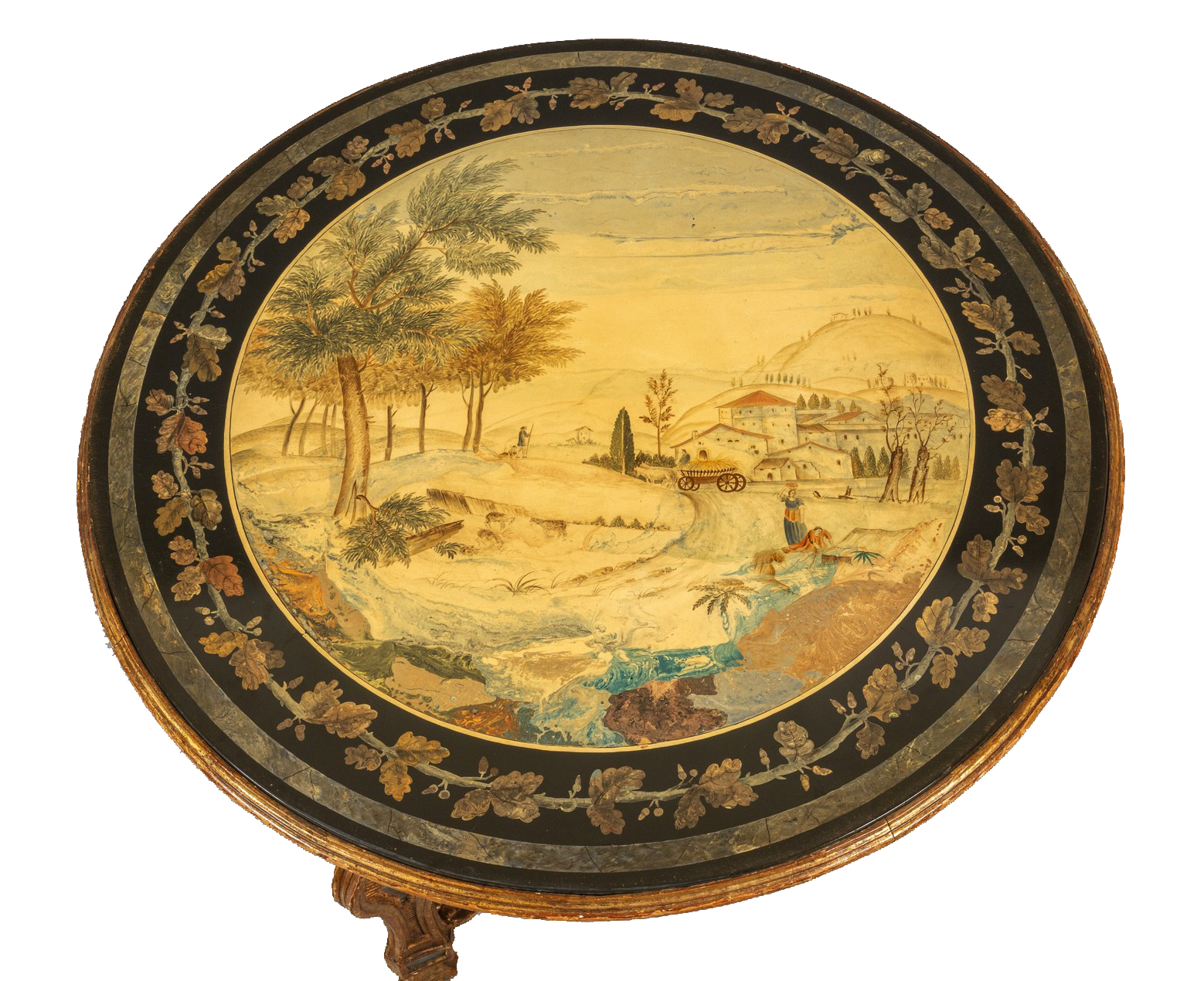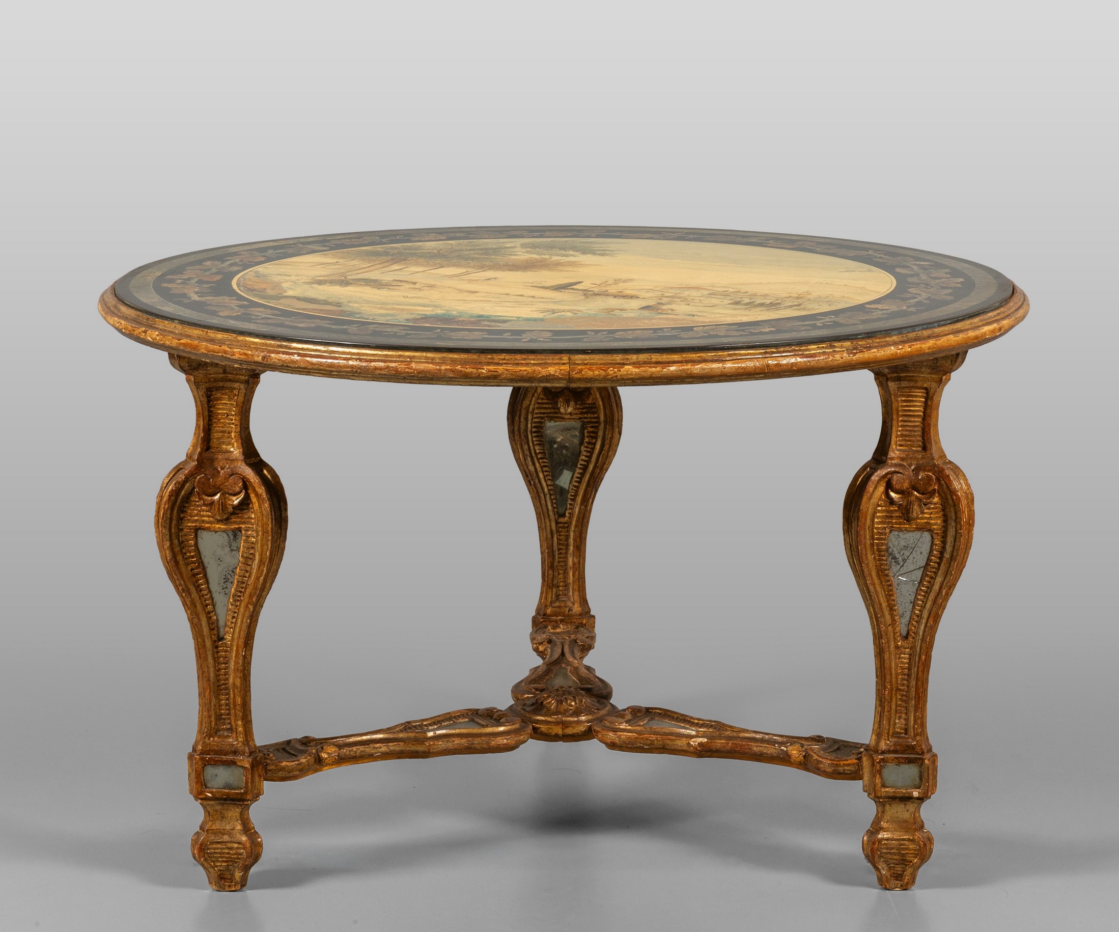 Gambe riunite da traversa in legno dorato con applicazioni di specchi,