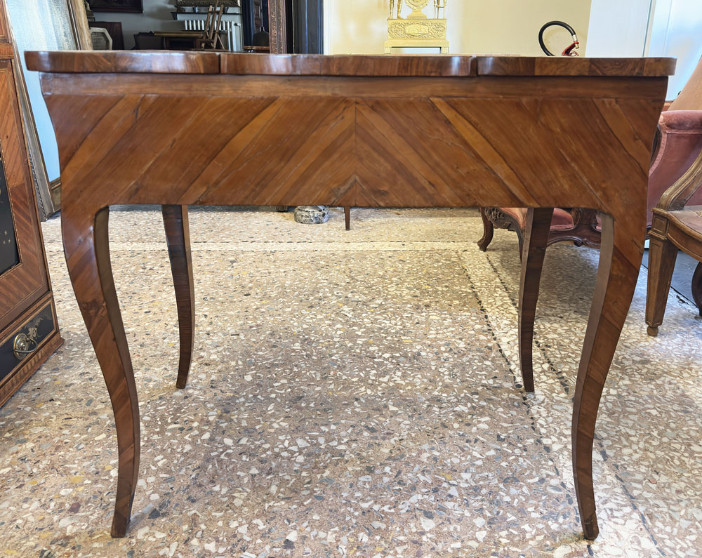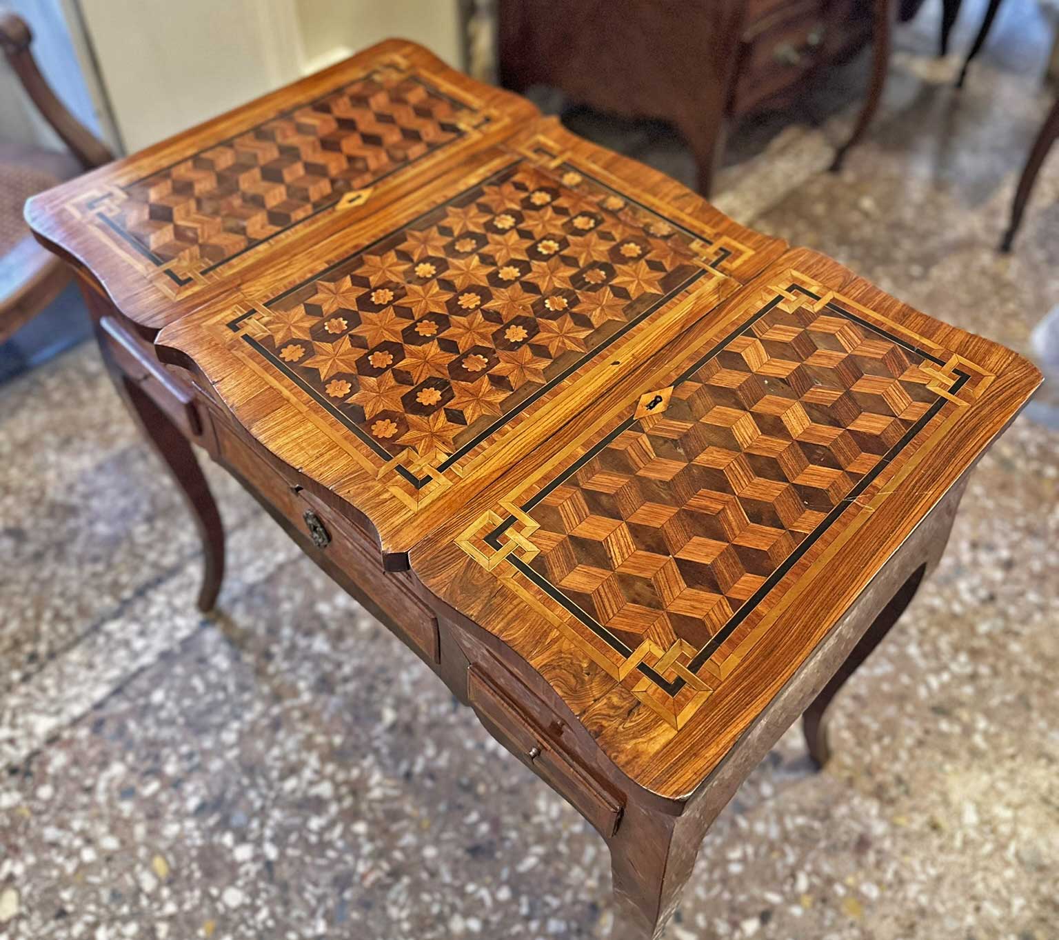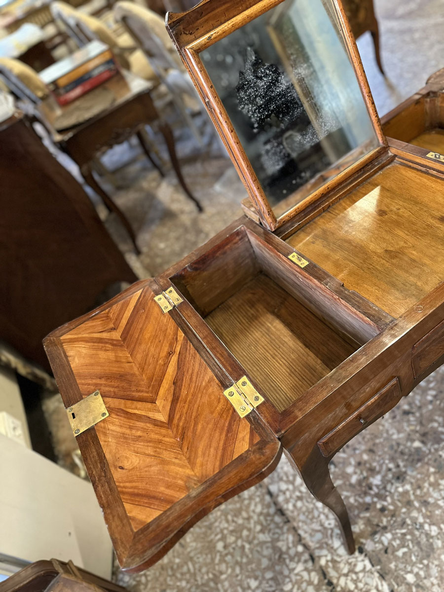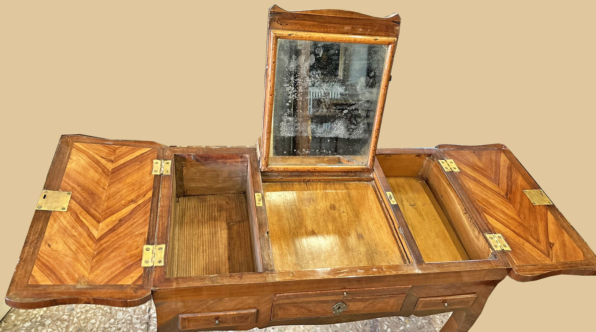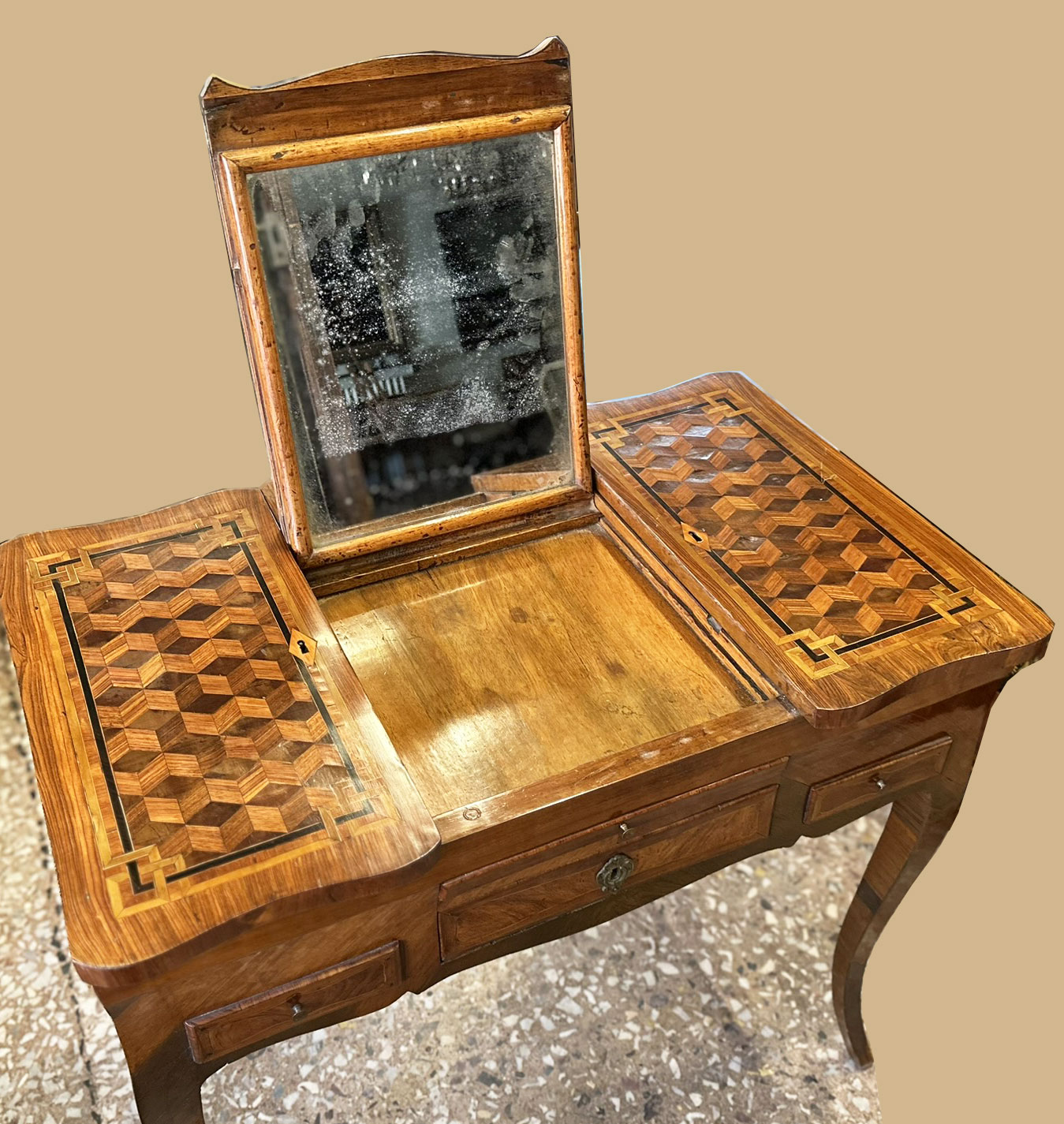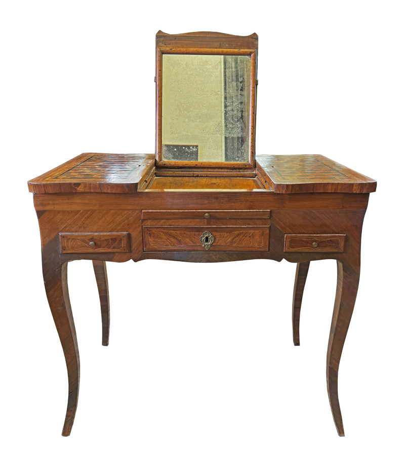 L’elegante mobile si distingue per la raffinatezza delle forme e per la ricchezza del decoro, in perfetto stile Luigi XV. Il piano, suddiviso in tre scomparti apribili, è decorato con una marqueterie geometrica di grande qualità, realizzata con legni di varie essenze disposti a creare giochi ottici e tridimensionali. Il vano centrale cela uno specchio coevo incorniciato, mentre il fronte sagomato presenta tre cassetti di cui uno centrale più ampio. Le gambe, mosse e affusolate, conferiscono leggerezza e grazia all’insieme.