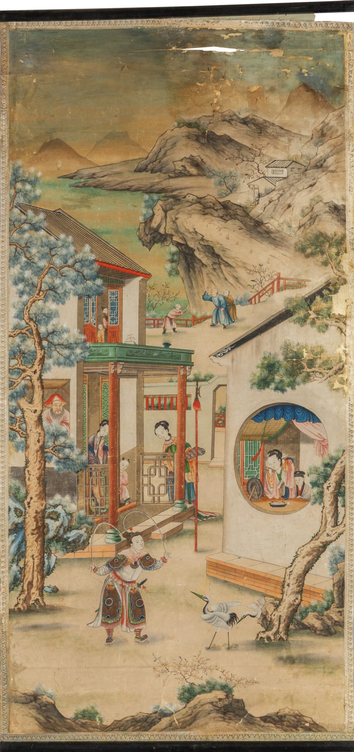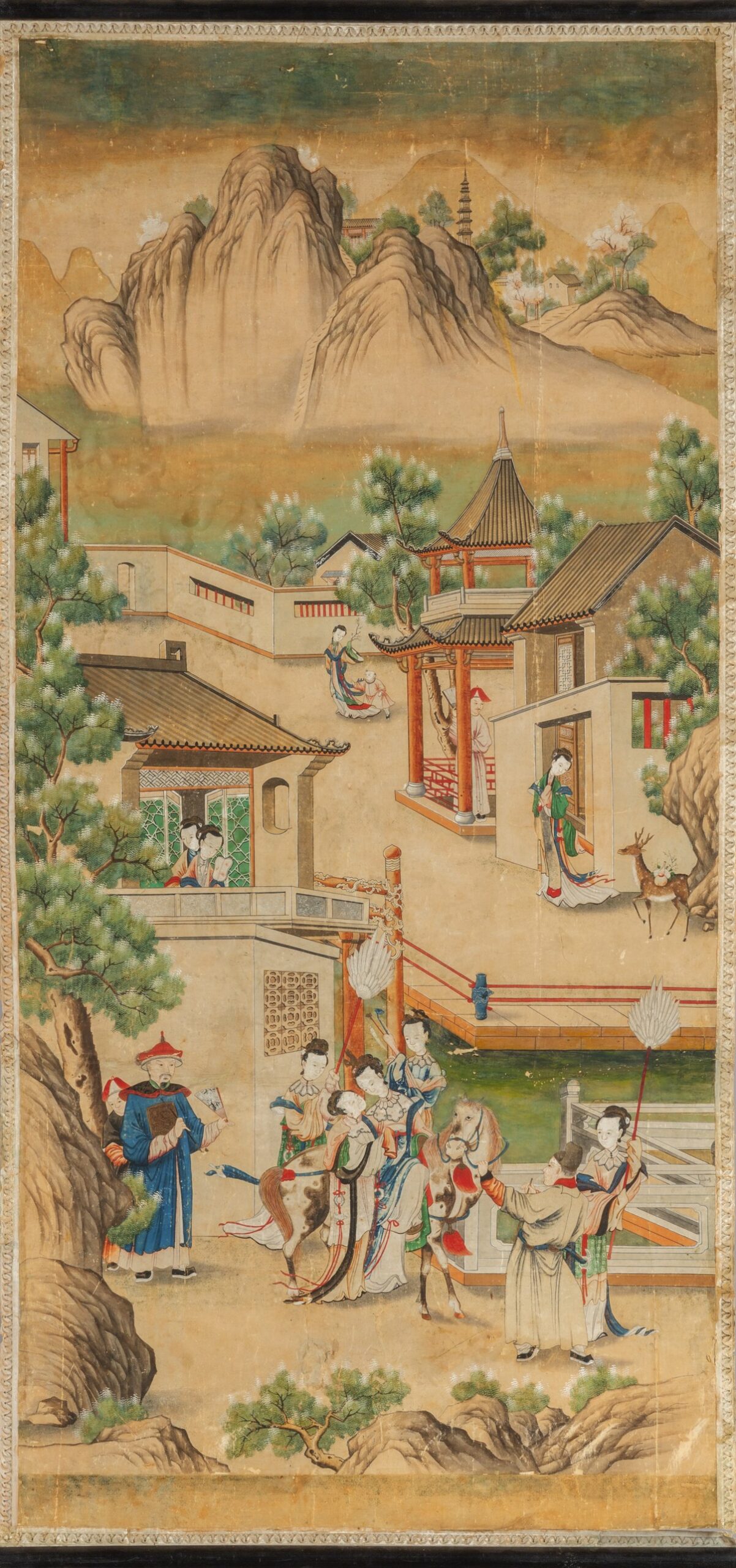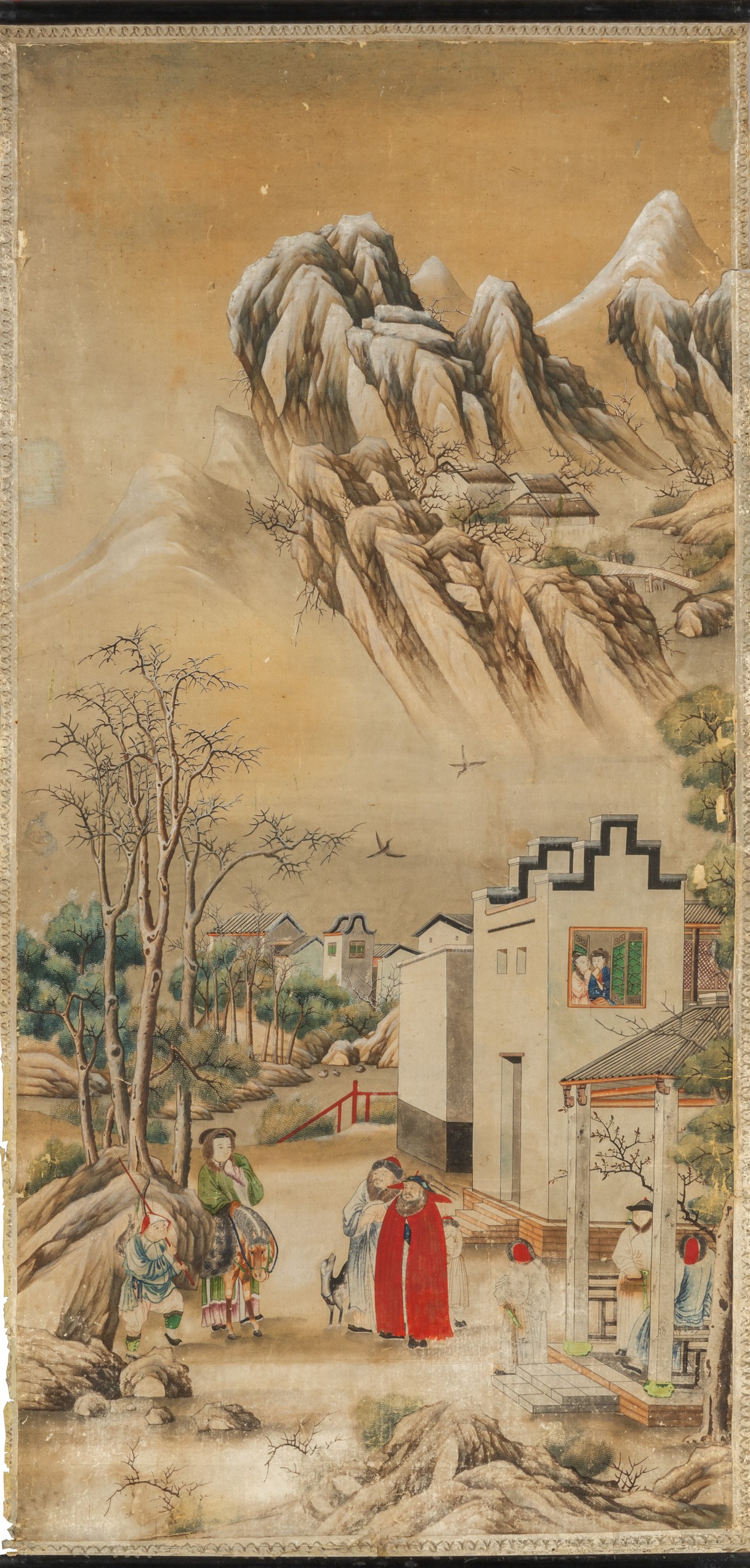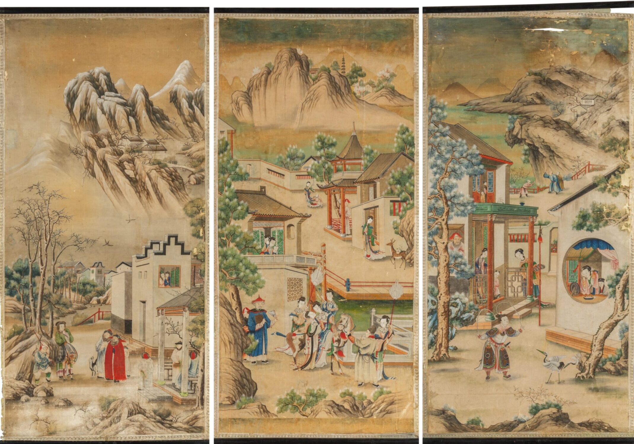 Paesaggi con scene di vita cinese, tre rotoli dipinti su carta, Cina secolo XVIII
