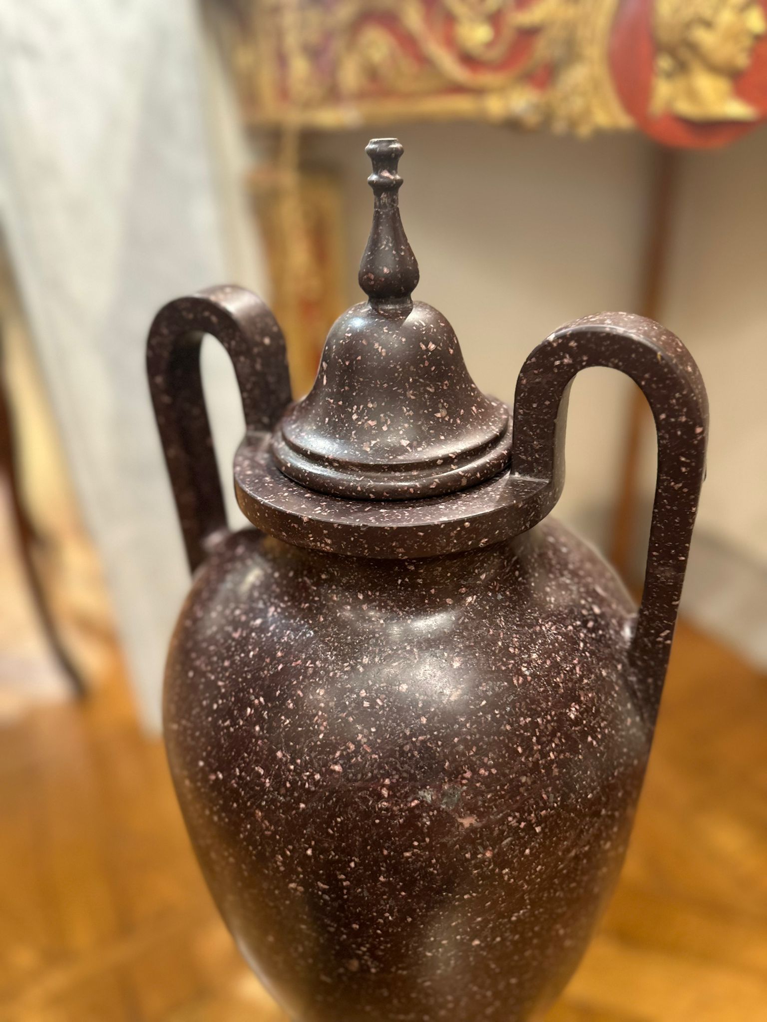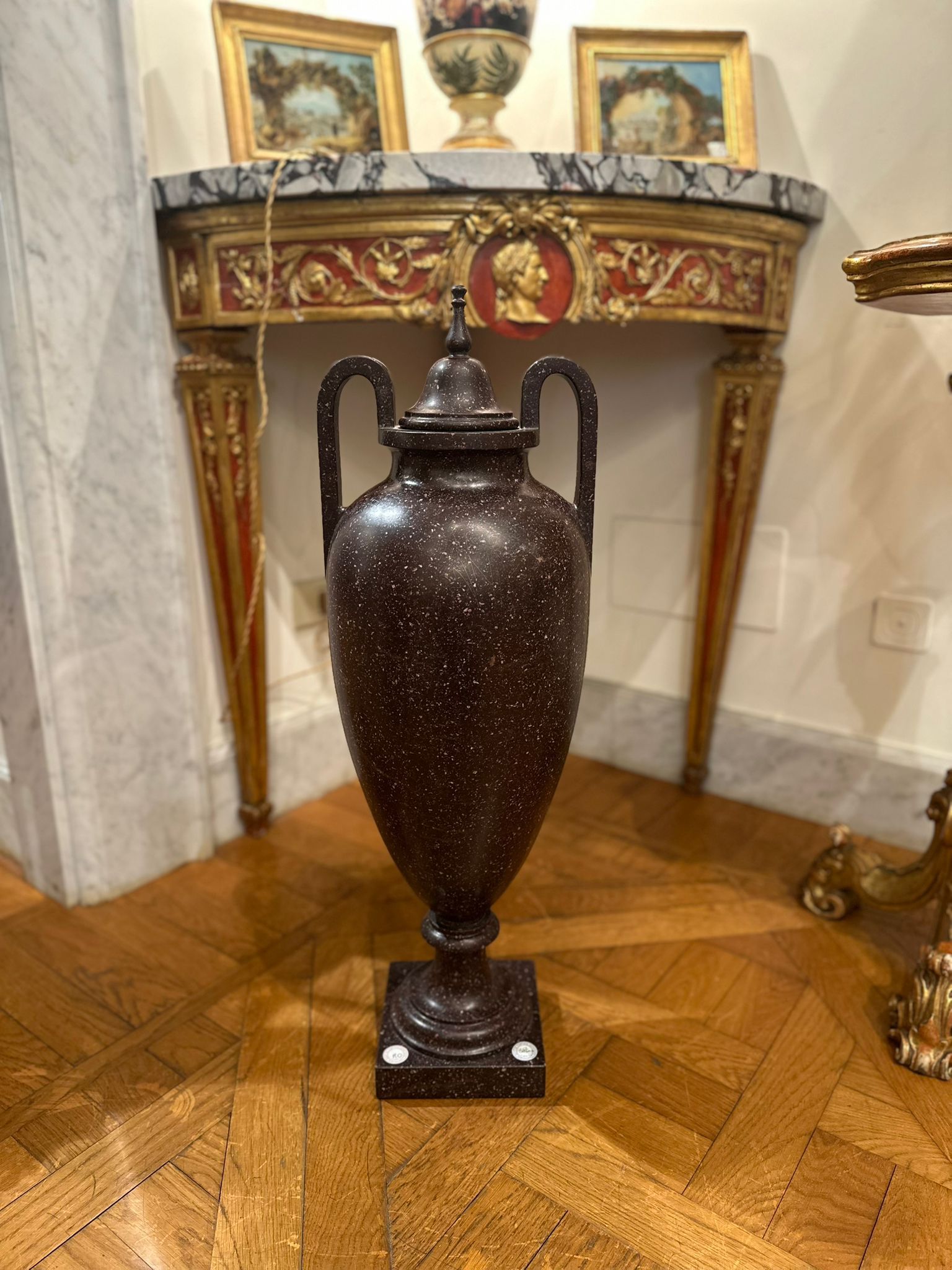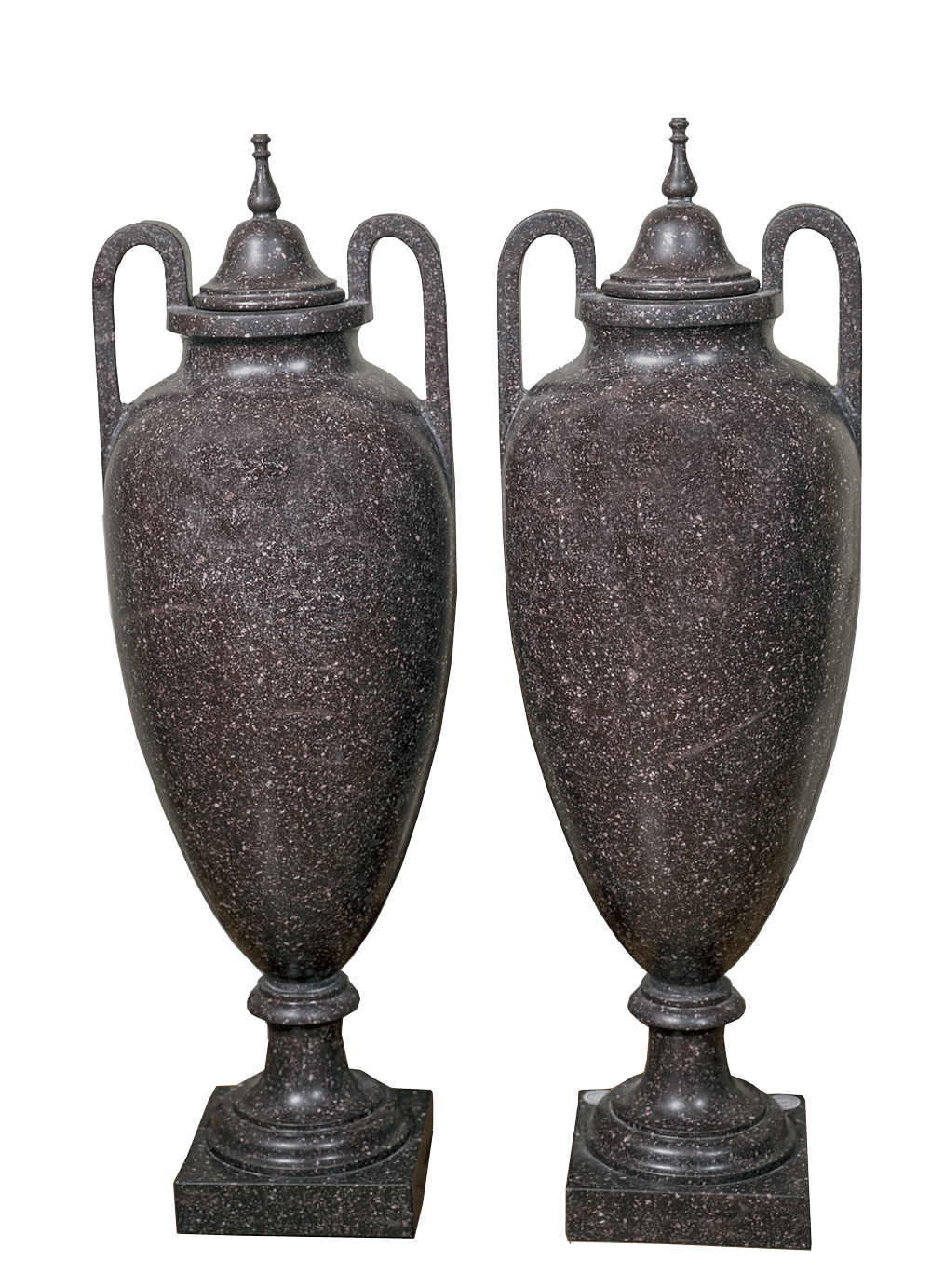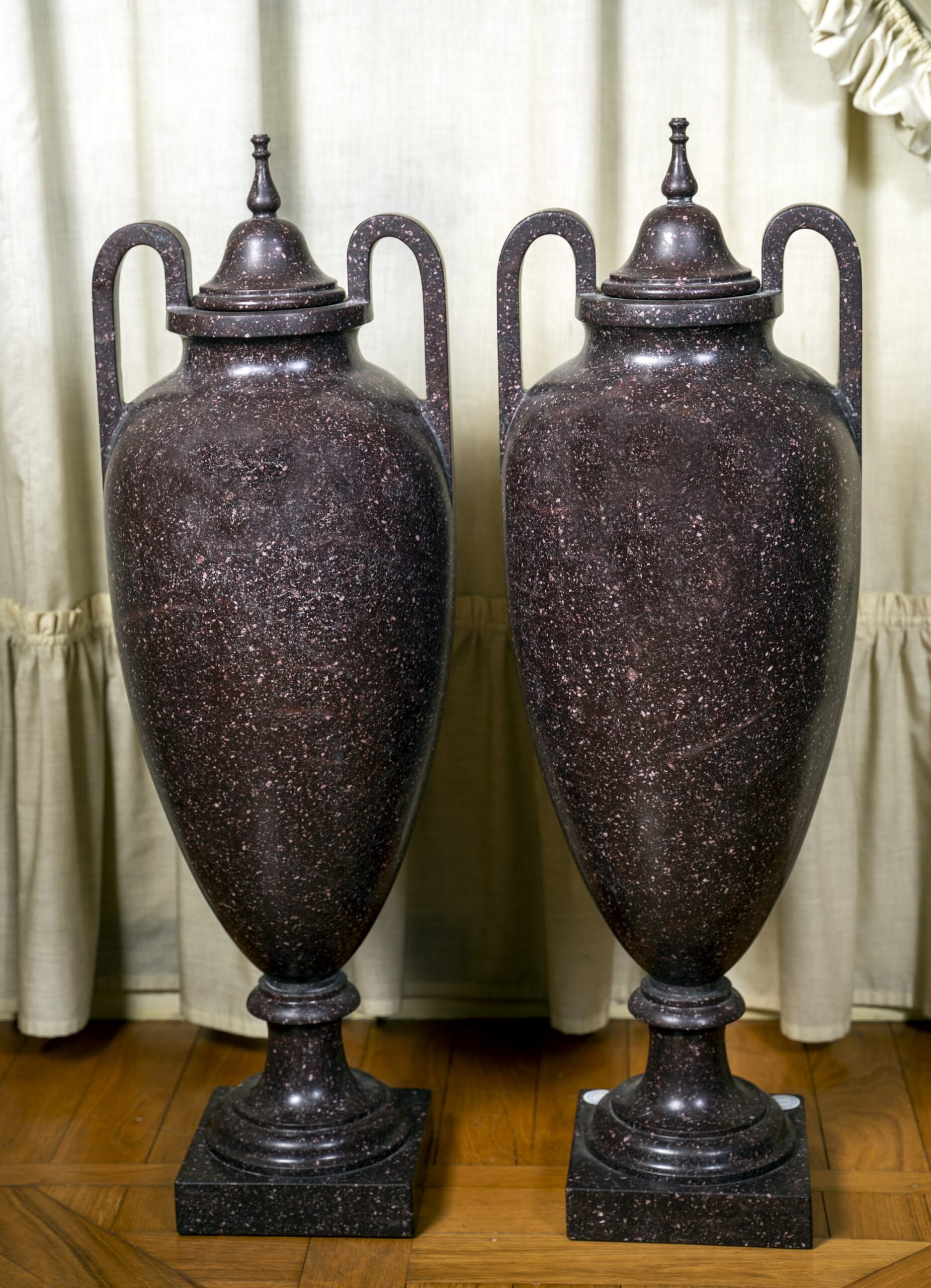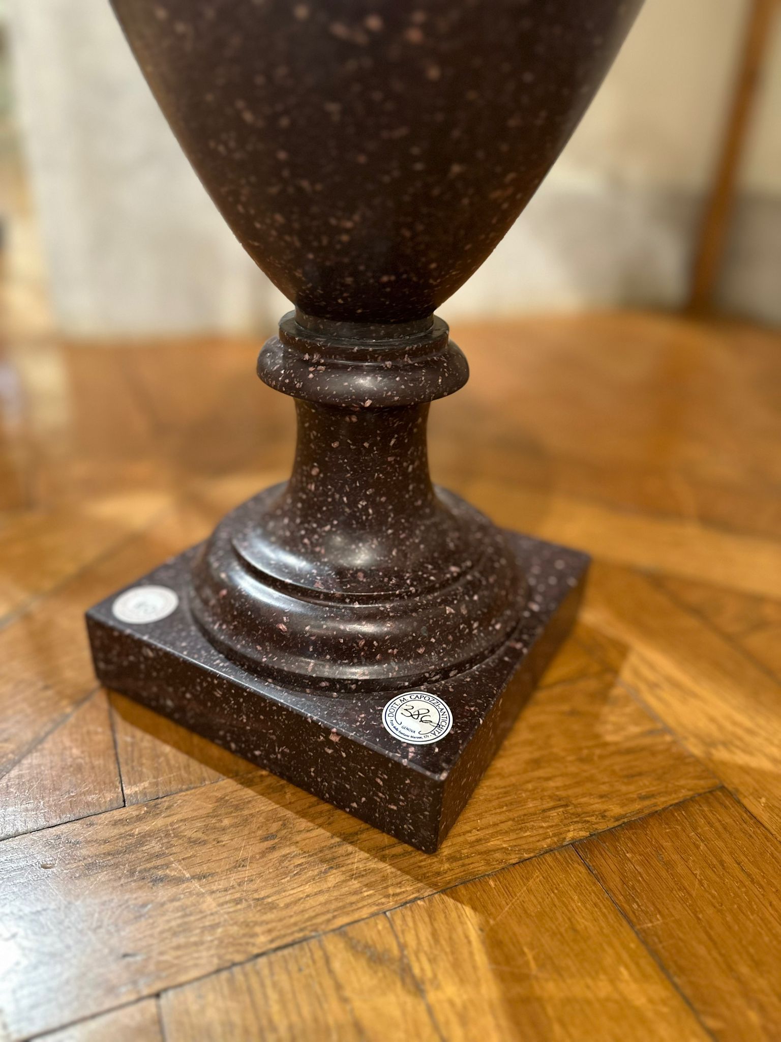 La preziosa pietra dura, caratterizzata da una fitta tessitura granulare di tonalità bruno-porpora con inclusioni più chiare, conferisce ai manufatti una forte presenza plastica e un raffinato effetto decorativo, tipico della produzione ornamentale ottocentesca ispirata ai modelli dell’antichità classica. L’insieme rivela un’eccellente qualità esecutiva e un’attenta lavorazione del materiale lapideo, probabilmente destinata a un contesto di rappresentanza, come saloni, scaloni o giardini d’inverno.