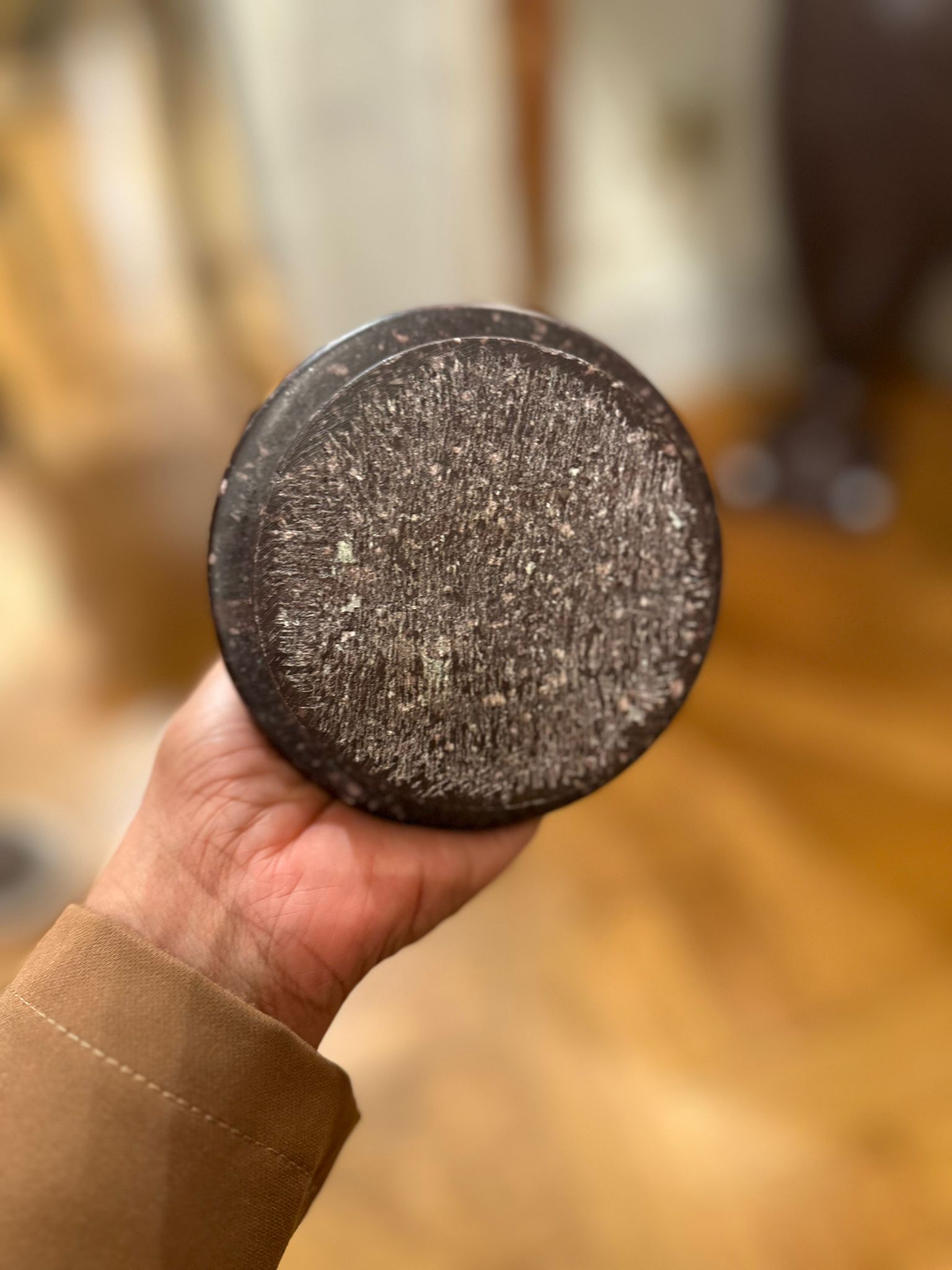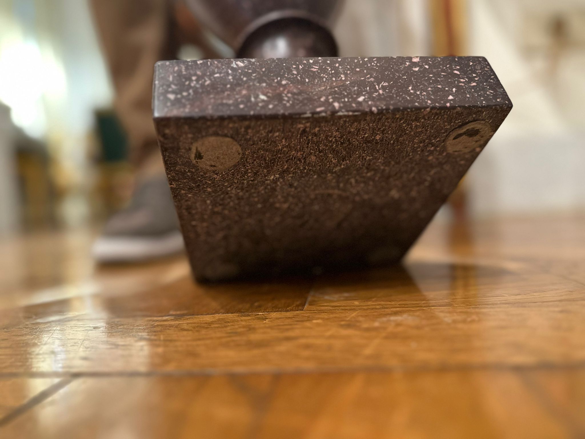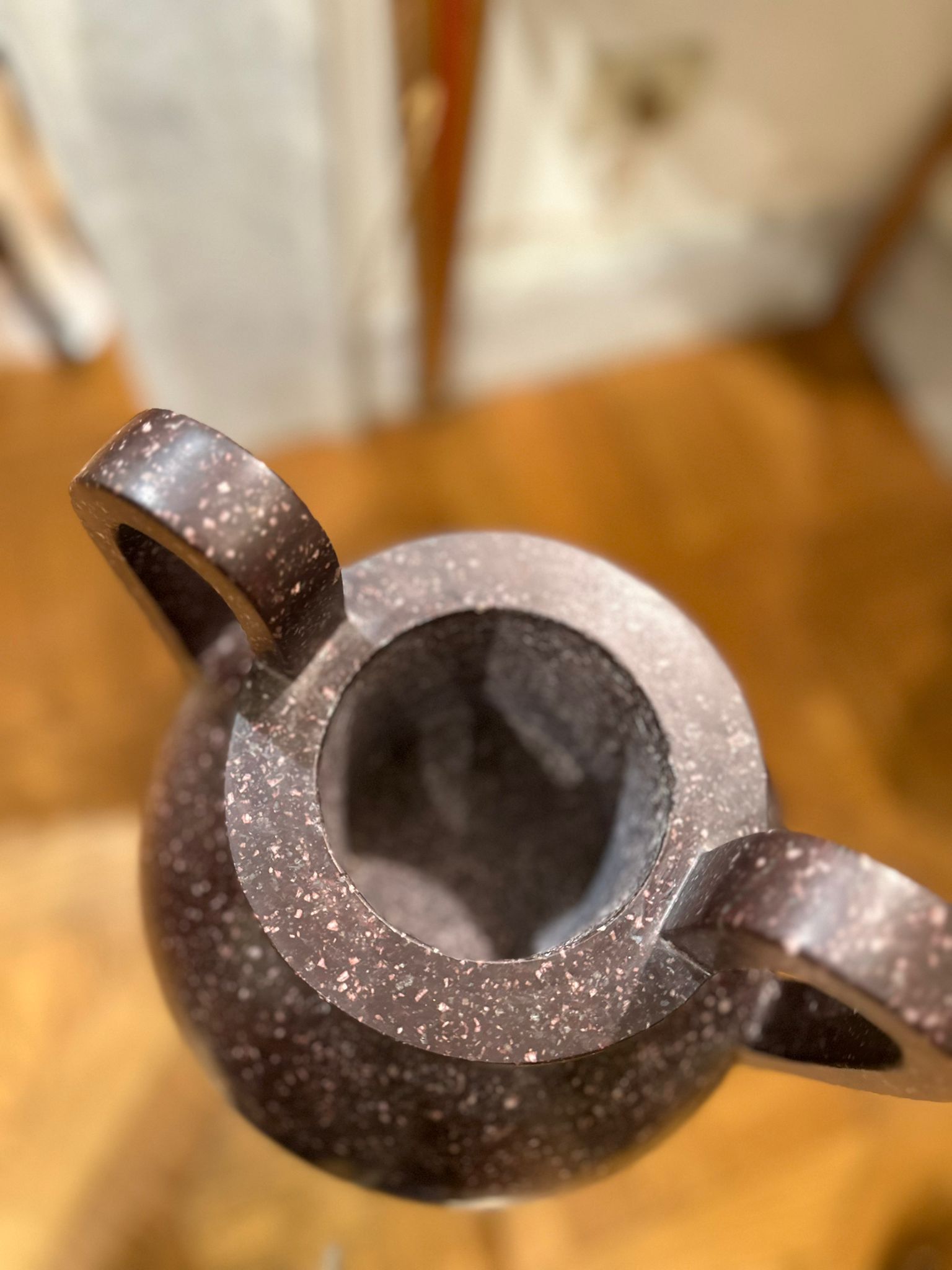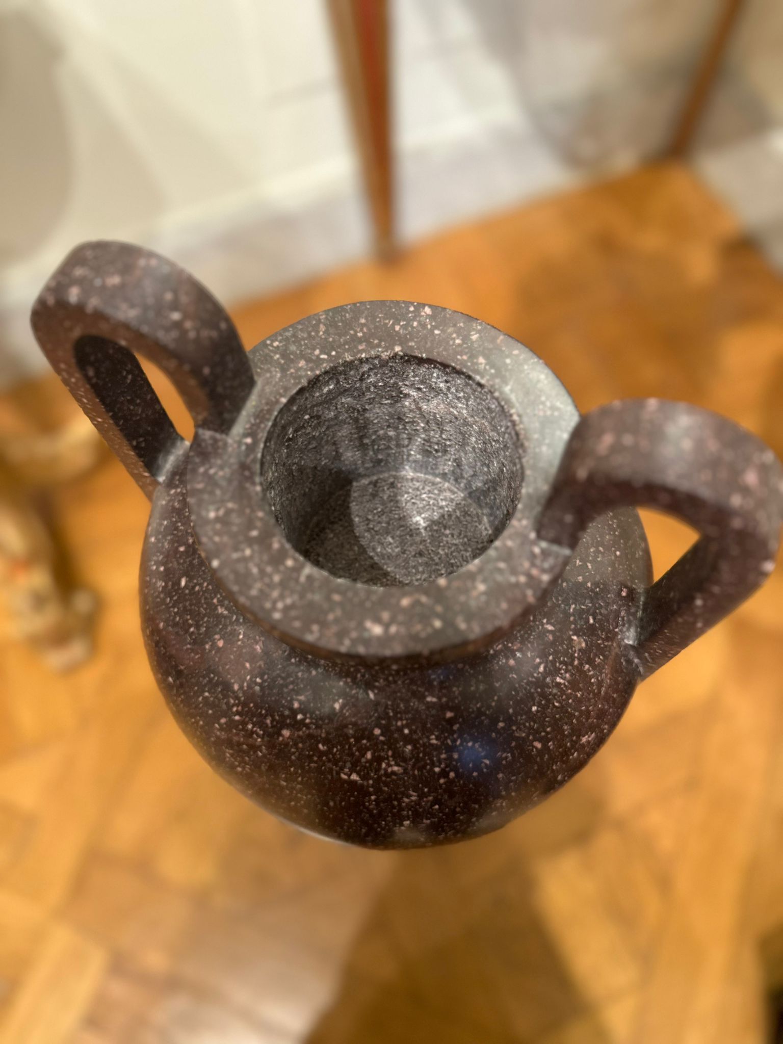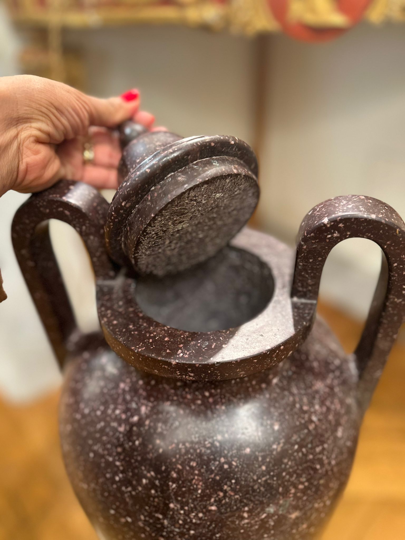 La preziosa pietra dura, caratterizzata da una fitta tessitura granulare di tonalità bruno-porpora con inclusioni più chiare, conferisce ai manufatti una forte presenza plastica e un raffinato effetto decorativo, tipico della produzione ornamentale ottocentesca ispirata ai modelli dell’antichità classica. L’insieme rivela un’eccellente qualità esecutiva e un’attenta lavorazione del materiale lapideo, probabilmente destinata a un contesto di rappresentanza, come saloni, scaloni o giardini d’inverno.