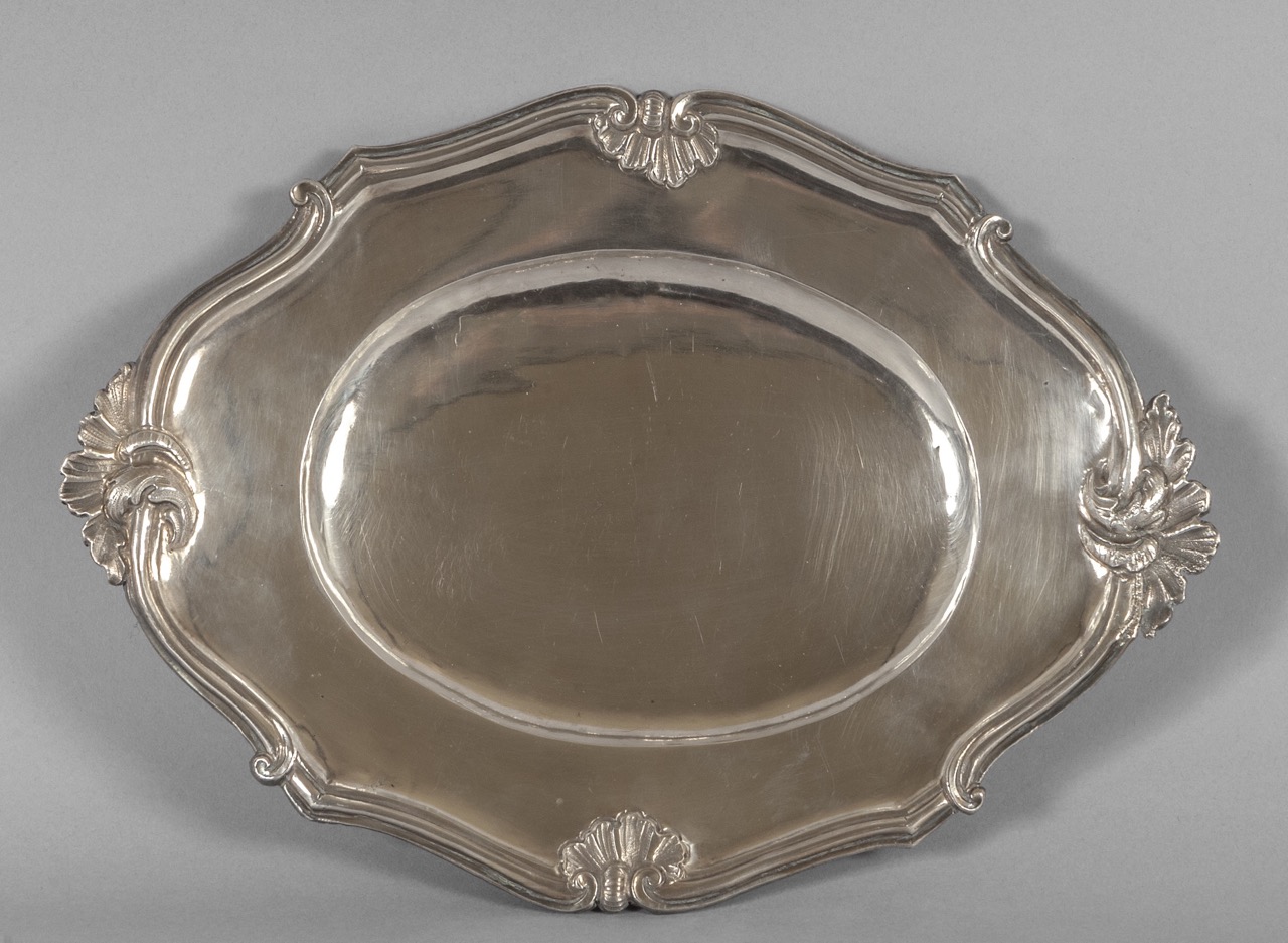 Vassoio Luigi XV di forma barocca in argento sbalzato con pellacce ai quattro angoli, Genova punzone della Torretta anno 1765
