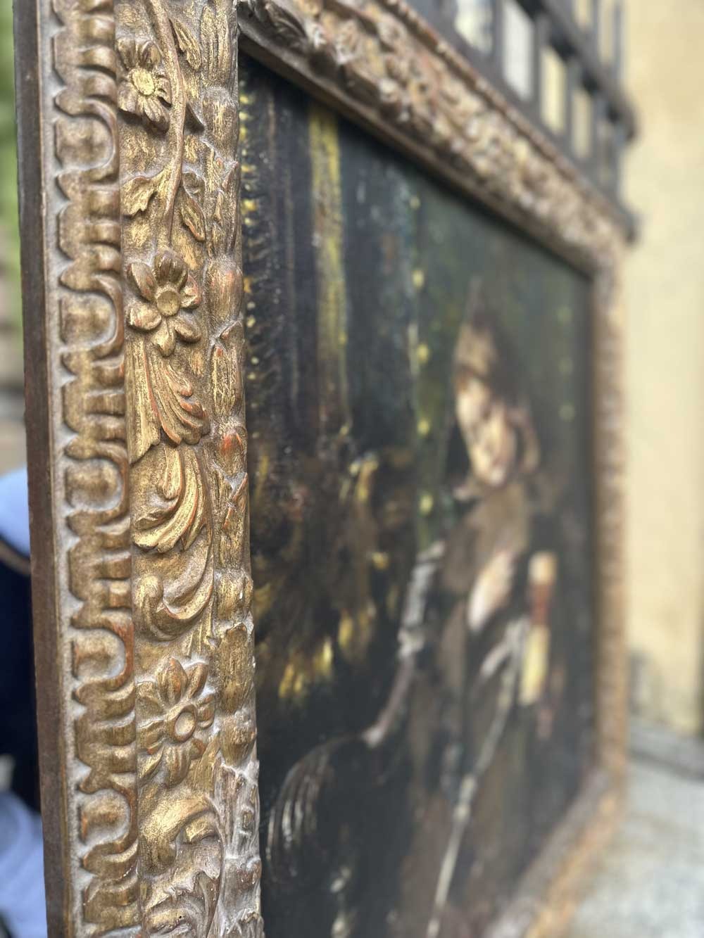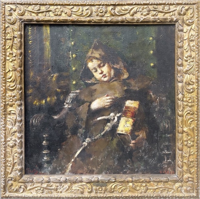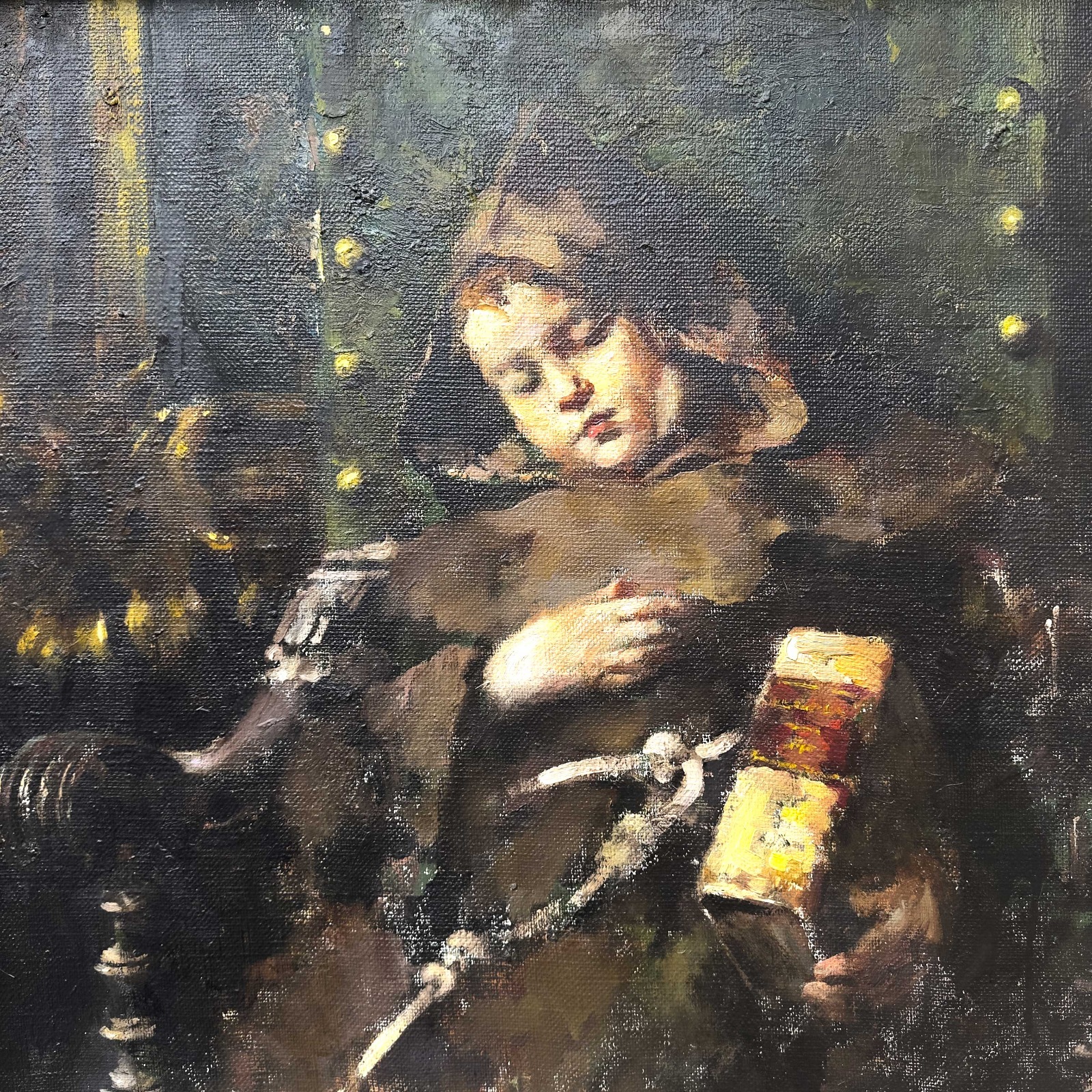 Un giovane frate, colto in un momento di silenzio e abbandono, diventa protagonista di un’immagine intima e sospesa. Il volto chino e le mani che stringono un libro suggeriscono meditazione, studio o preghiera; la luce, morbida e concentrata, accarezza i lineamenti lasciando lo sfondo in una penombra vibrante, costruita da pennellate sciolte e atmosferiche.