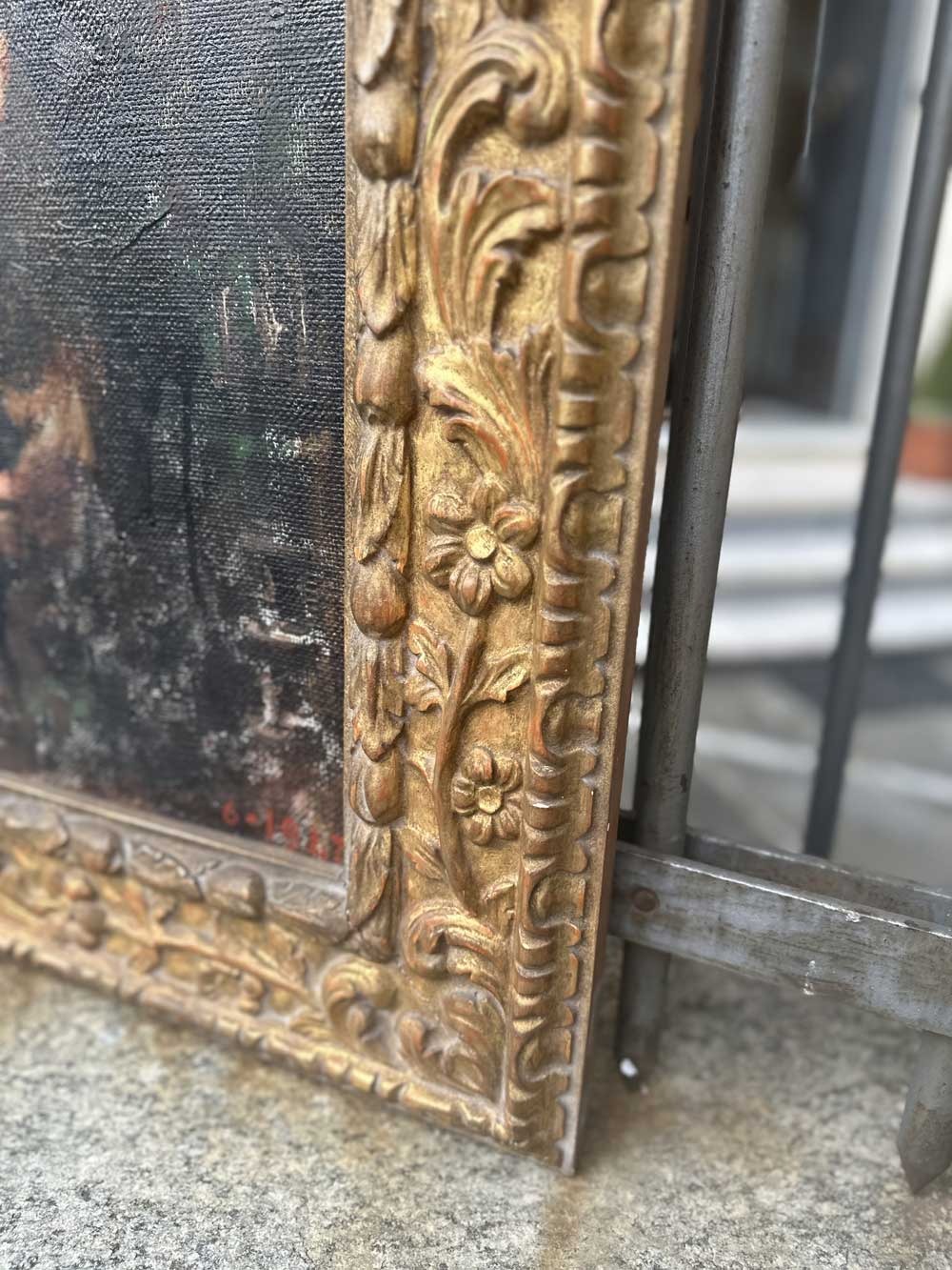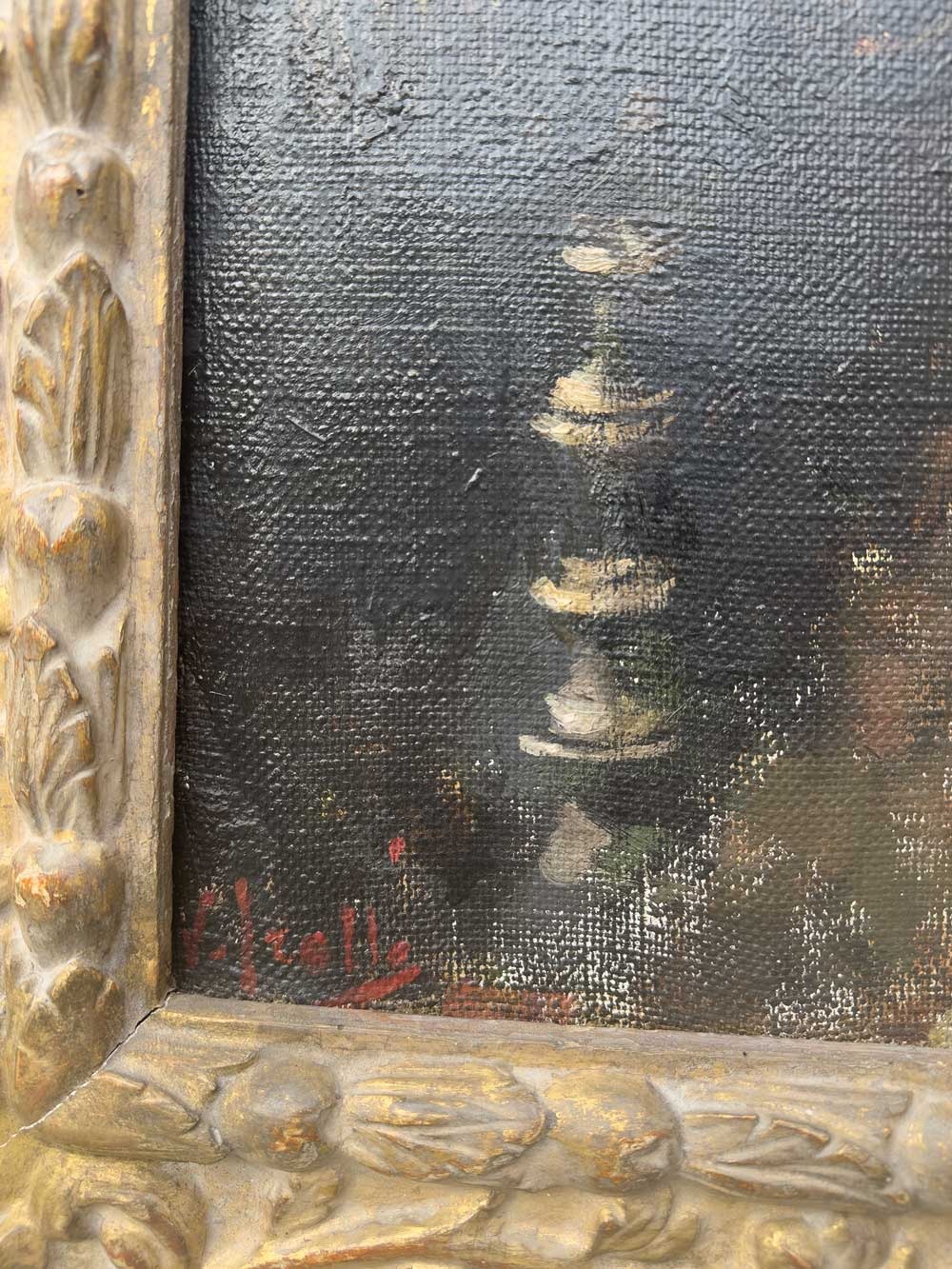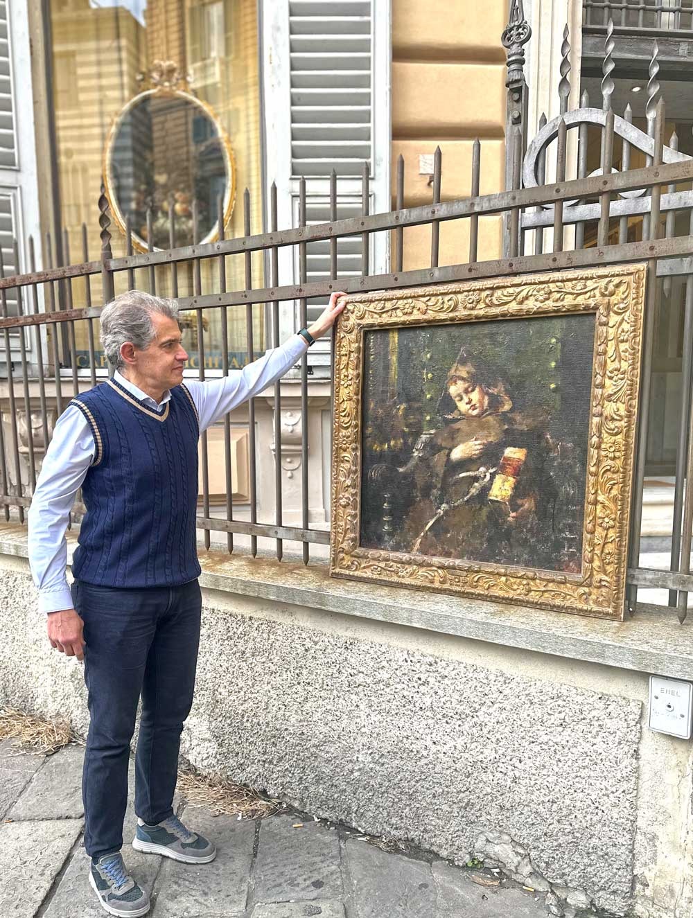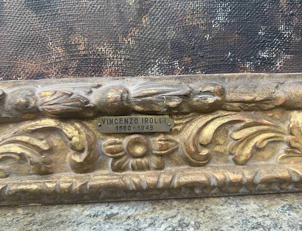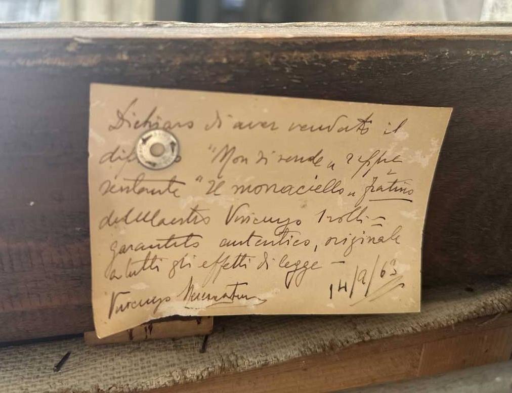 Il titolo richiama la figura popolare napoletana del “monaciello”, presenza a metà tra devozione e mito urbano: un simbolo della città in cui sacro e quotidiano convivono. In basso compaiono firma e data – “V. Irolli” e “6-1947” – insieme a un’iscrizione dal tono quasi programmatico: “non si vende a fine se stesso…”, come a ribadire che l’immagine non è semplice esercizio pittorico, ma racconto e sentimento, memoria e significato. Un dipinto che unisce tenerezza e mistero, trasformando un piccolo personaggio in una poesia visiva.