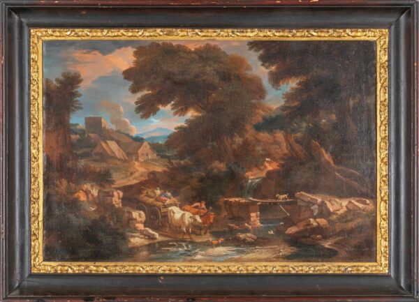 Pieter Mulier (Haarlem 1637 Milano 1701) Paesaggio con personaggi che guadano un fiume, olio su tela