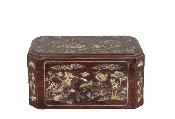 Scatola in legno intarsiato con madreperla raffigurante scene di vita orientale e fiori, Cina secolo XIX