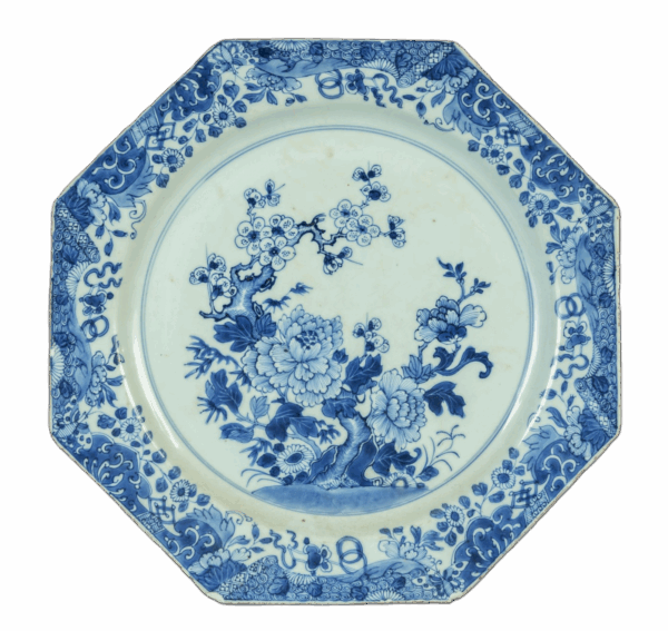 Piatto in porcellana di forma ottagonale decorato a fiori, Cina inizi secolo XIX