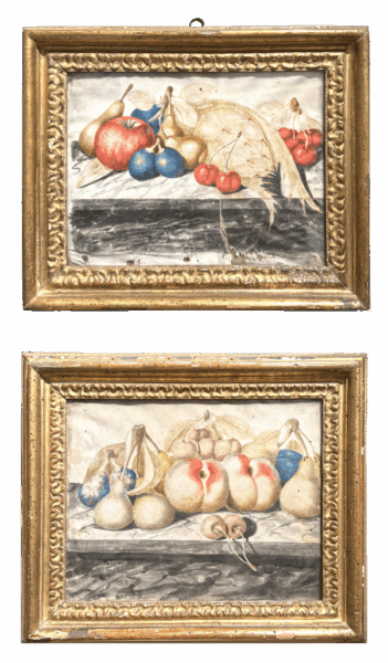 Coppia di tempere su carta raffiguranti nature morte con frutta, riconducibili all’ambito di Monfort, Piemonte secolo XVII