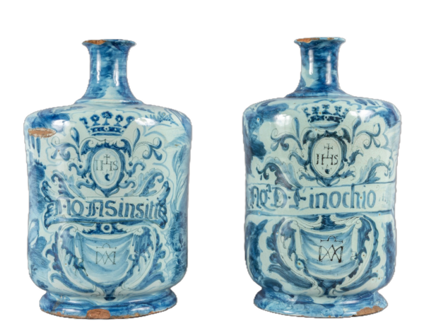 Coppia di bottiglie in maiolica, decorazione bianca e blu con personaggi, marca Stemma, Savona secolo XVII