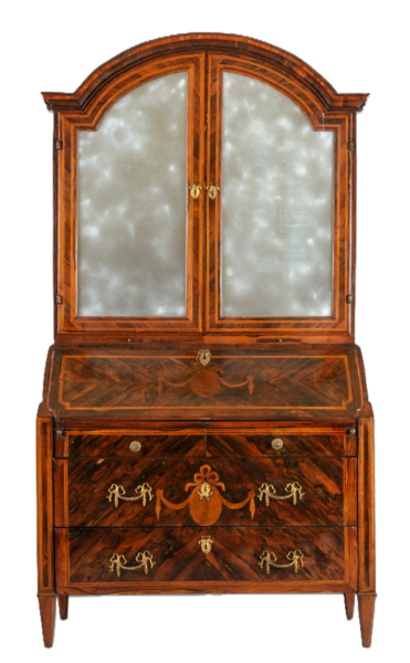 Trumeau o doppio corpo Luigi XVI lastronato, filettato e intarsiato con medaglioni e nastri, Genova II metà secolo XVIII