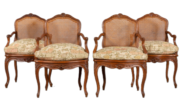 Quattro poltroncine Luigi XV in legno intagliato, sedile e schienale a canné, Francia I metà secolo XVIII