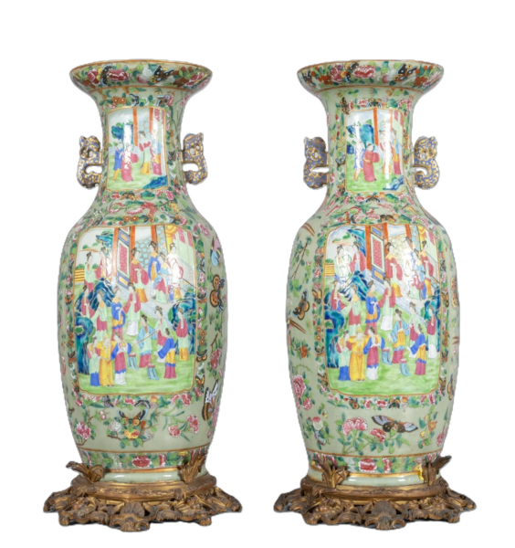 Coppia di vasi in porcellana decorata in policromia con basi in bronzo dorato, Cina secolo XIX