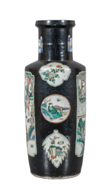 Vaso in porcellana cinese Famiglia Verde, decorato a riserve policrome con scene di vita orientale, Cina secolo XIX.