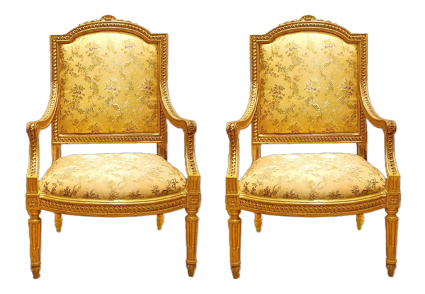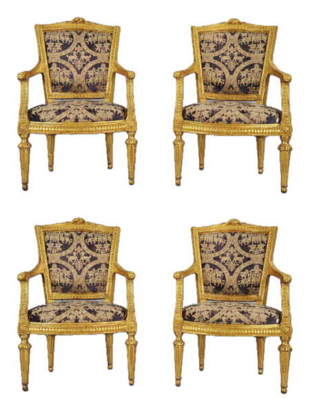 Quattro importanti poltrone Luigi XVI in legno finemente intagliato e dorato Genova seconda metà secolo XVIII.