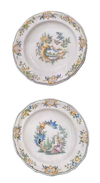 Coppia di piatti in ceramica decorati a rocaille, Torino, metà XVIII secolo.