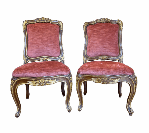Suite di sei sedie Luigi XV decorate a pellacce e motivi vegetali in noce con lumeggiature dorate, Genova metà XVIII secolo.
