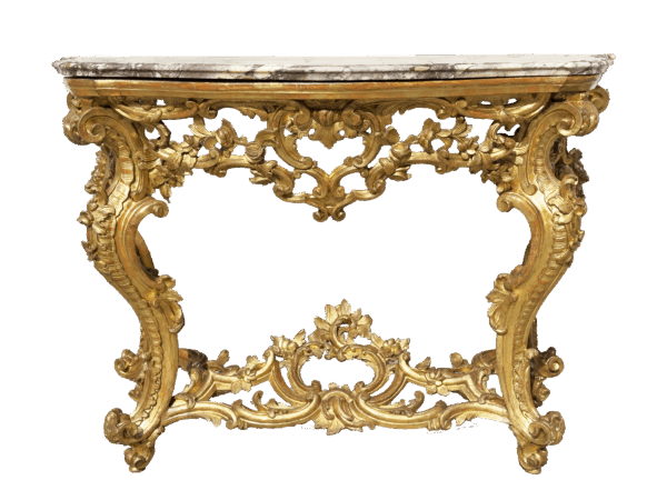 Console Luigi XV in legno finemente intagliato e dorato, piano in marmo fior di pesco, Genova metà XVIII secolo.