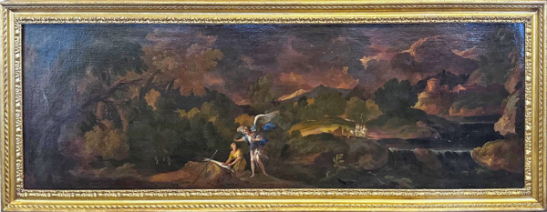 Tobia e l’Arcangelo Raffaele in paesaggio boschivo, olio su tela, Genova inizio XVIII secolo